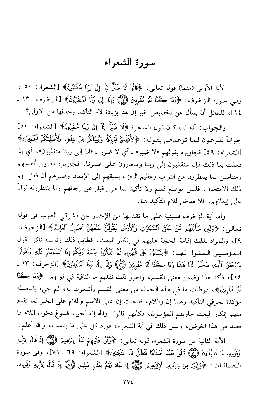 الآية الأولى (منها) قوله تعالى: (قَالُوا لَا ضَيْرَ إِنَّا إِلَى رَبِّنَا مُنْقَلِبُونَ) (الشعراء: 50)، وفي سورة الزخرف: (وَمَا كُنَّا لَهُ مُقْرِنِينَ * وَإِنَّا إِلَى رَبِّنَا لَمُنْقَلِبُونَ) (الزخرف: 13 - 14)، للسائل أن يسأل عن تخصيص خبر إن هنا بزياد لام التأكيد وحذفها من الأولى؟