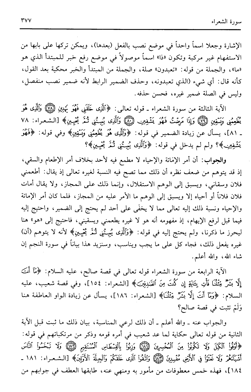 الآية الثالثة من سورة الشعراء - قوله تعالى: (الَّذِي خَلَقَنِي فَهُوَ يَهْدِينِ * وَالَّذِي هُوَ يُطْعِمُنِي وَيَسْقِينِ * وَإِذَا مَرِضْتُ فَهُوَ يَشْفِينِ * وَالَّذِي يُمِيتُنِي ثُمَّ يُحْيِينِ) (الشعراء: 78 - 81)، يسأل عن زيادة الضمير في قوله: (وَالَّذِي هُوَ يُطْعِمُنِي وَيَسْقِينِ) وفي قوله: (فَهُوَ يَشْفِينِ)؟ ولم لم يدخل في قوله: (وَالَّذِي يُمِيتُنِي ثُمَّ يُحْيِينِ)؟