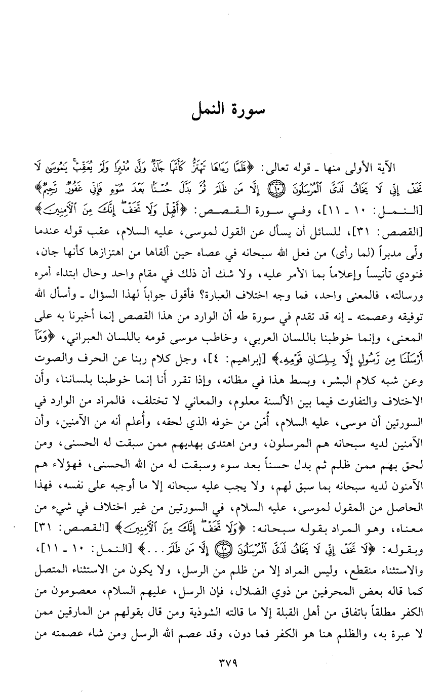 الآية الأولى منها - قوله تعالى: (فَلَمَّا رَآهَا تَهْتَزُّ كَأَنَّهَا جَانٌّ وَلَّى مُدْبِرًا وَلَمْ يُعَقِّبْ يَا مُوسَى لَا تَخَفْ إِنِّي لَا يَخَافُ لَدَيَّ الْمُرْسَلُونَ * إِلَّا مَنْ ظَلَمَ ثُمَّ بَدَّلَ حُسْنًا بَعْدَ سُوءٍ فَإِنِّي غَفُورٌ رَحِيمٌ) (النمل: 10 - 11)، وفي سورة القصص: (أَقْبِلْ وَلَا تَخَفْ إِنَّكَ مِنَ الْآمِنِينَ) (القصص: 31)، للسائل أن يسأل عن القول لموسى، عليه السلام، عقب قوله عندما ولّلى مدبراً (لما رأى) من فعل الله سبحانه في عصاه حين ألقاها من اهتزازها كأنها جان، فنودي تأنيساً وإعلاماً بما الأمر عليه، ولا شك أن ذلك في مقام واحد وحال ابتداء أمره ورسالته، فالمعنى واحد، فما وجه اختلاف العبارة؟ فأقول جواباً لهذا السؤال - وأسأل الله توفيه وعصمته - إنه قد تقدم في سورةطه أن الوارد من هذا القصص إنما أخبرنا به على المعنى، وإنما خوطبنا باللسان العربي، وخاطب موسى باللسان العبراني، (وَمَا أَرْسَلْنَا مِنْ رَسُولٍ إِلَّا بِلِسَانِ قَوْمِهِ) (إبراهيم: 4)، وجل كلام ربنا عن الحرف والصوت وعن شبه كلام البشر، وبسط هذا في مظانه، وإذا تقرر أنا إنما خوطبنا بلساننا، وأن الاختلاف والتفاوت فيما بين الألسنة معلوم، والمعاني لا تخلتف، فالمراد من الوارد في السورتين أن موسى، عليه السلام، أُمن من خوفه الذي لحقه، وأُعلم أنه من الآمنين، وأن الآمنين لديه سبحانه هم المرسلون، ومن اهتدى بهديهم ممن سبقت له الحسنى، ومن لحق بهم ممن ظلم ثم بدل حسناً بعد سوء وسبقت له من الله الحسنى، فهؤلاء هم الآمنون لدينه سبحانه بما سبق لهم، ولا يجب عليه سبحانه إلا ما أوجبه على نفسه، فهذا الحاصل من المقول لموسى، عليه السلام، في السورتين من غير اختلاف في شيء من معناه، وهو المراد بقوله سبحانه: (وَلَا تَخَفْ إِنَّكَ مِنَ الْآمِنِينَ) (القصص: 31)، وبقوله: (لَا تَخَفْ إِنِّي لَا يَخَافُ لَدَيَّ الْمُرْسَلُونَ * إِلَّا مَنْ ظَلَمَ ... ) (النمل: 10 - 11)، والاستثناء منقطع، وليس المراد إلا من ظلم من الرسل، ولا يكون من الاستثناء المتصل كما قاله بعض المحرفين من ذوي الضلال، فإن الرسل، عليهم السلام، معصومون من الكفر مطلقاً باتفاق من أهل القبلة إلا ما قالته الشوذية ومن قال بقولهم من المارقين ممن لا عبرة به، والظلم هنا هو الكفر فما دون، وقد عصم الله الرسل ومن شاء عصمته من