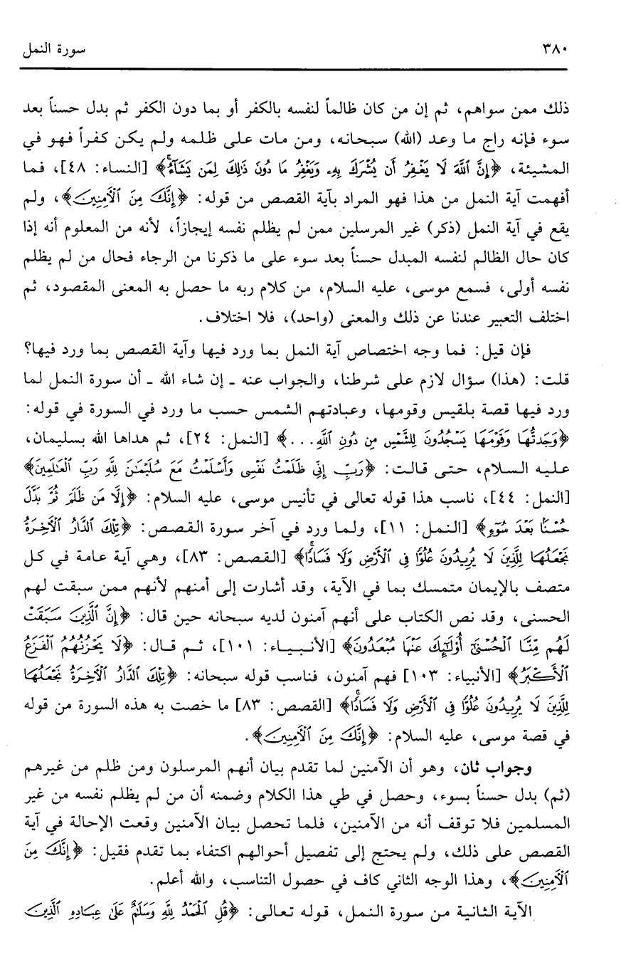 وجواب ثان، وهو أن الآمنين لما تقدم بيان أنهم المرسلون ومن ظلم من غيرهم (ثم) بدل حسناً بسوء، وحصل في طي هذا الكلام وضمنه أن من لم يظلم نفسه من غير المسلمين فلا توقف أنه من الآمنين، فلما تحصل بيان الآمنين وقعت الإالة في آية القصص على ذلك، ولم يحتج إلى تفصيل أحوالهم اكتفاء بما تقدم فقيل: (إِنَّكَ مِنَ الْآمِنِينَ)، وهذا الوجه الثاني كاف في حصول التناسب، والله أعلم.