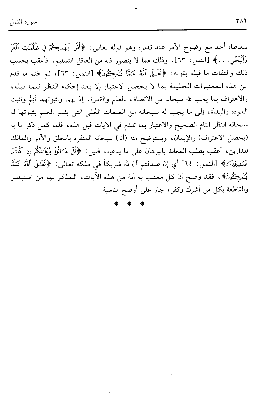 يتعاطاه أحد مع وضوح الأمر عند تدبره وهو قوله تعالى: (أَمَّنْ يَهْدِيكُمْ فِي ظُلُمَاتِ الْبَرِّ وَالْبَحْرِ ... ) (النمل: 63)، ذلك مما لا يتصور فيه من العاقل التسليم، فأعقب بحسب ذلك والتفات ما قبله بقوله: (تَعَالَى اللَّهُ عَمَّا يُشْرِكُونَ) (النمل: 63)، ثم ختم ما قدم من هذه المعتبرات الجليلة بما لا يحصل الاعتبار إلا بعد إحكام النظر فيما قبله، والاعتراف بما يجب لله سبحانه من الاتصاف بالعلم والقدرة، إذ بهما وبقوبتها تَتِمُّ وتثبتت العةدة والبدأة، إلى ما يجب له سبحانه من الصفات العُلى التي يثمر العلم بثبوتها له سبحانه النظر التام الصحيح والاعتبار بما تقدم في الآيات قبل هذه، فلما كمل ذكر ما به (يحصل الاعتراف) والإيمان، ويستوضح منه (أنه) سبحانه المنفرد بالخلق والأمر والمالك للدارين، أعقب بطلب المعاند بالبرهان على ما يديعه، فقيل: (قُلْ هَاتُوا بُرْهَانَكُمْ إِنْ كُنْتُمْ صَادِقِينَ) (النمل: 64) أي إن صدقتم أن لله شريكاً في ملكه تعالى: (تَعَالَى اللَّهُ عَمَّا يُشْرِكُونَ) (النمل: 63)، فقد وضح أن كل معقب به آية من هذه الآيات، المذكر بها من استبصر والقاطعة بكل من أشرك وكفر، جار على أوضح مناسبة.