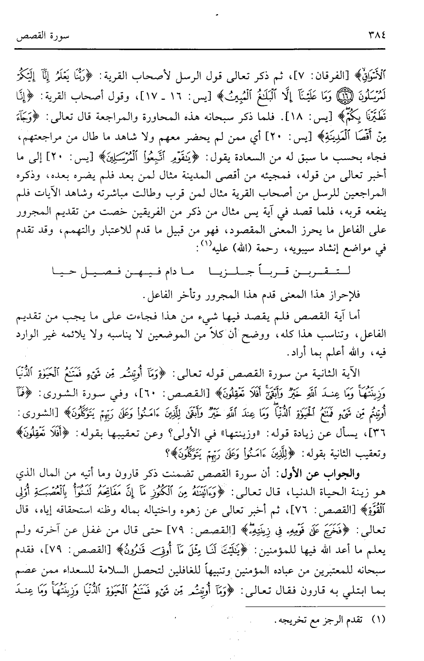 الْأَسْوَاقِ) (الفرقان: 7)، ثم ذكر تعالى قول الرسل لأصحاب القرية: (قَالُوا رَبُّنَا يَعْلَمُ إِنَّا إِلَيْكُمْ لَمُرْسَلُونَ *وَمَا عَلَيْنَا إِلَّا الْبَلَاغُ الْمُبِينُ) (يس: 16 - 17)، وقول أصحاب القرية: (إِنَّا تَطَيَّرْنَا بِكُمْ) (يس: 18). فلما ذكر سبحانه هذه المخاورة والمراجعة قال تعالى: (وَجَاءَ مِنْ أَقْصَى الْمَدِينَةِ) (يس: 20) أي ممن لم يحضر معهم ولا شاهد ما طال من مراجعتهم، فجاء بحسب ما سبق له من السعادة يقول: (يَا قَوْمِ اتَّبِعُوا الْمُرْسَلِينَ) (يس: 20) إلى ما أخبر تعالى من قوله، فمجيئه من أقصى المدينة مثال لمن بعد فلم يضره بعده، وذكره المراجعين للرسل من أصحاب القرية مثال لمن قرب وطالت مباشرته وشاهد الآيات فلم ينفعه قربه، فلما قصد في آية يس مثال من ذكر من الفريقين خصت من تقديم المجرور على الفاعل ما يحرز المعنى المقصود، فهو من قبيل ما قدم للاعتبار والتهمم، وقد تقدم في مواضع إنشاد سيبويه، رحمة (الله) عليه: