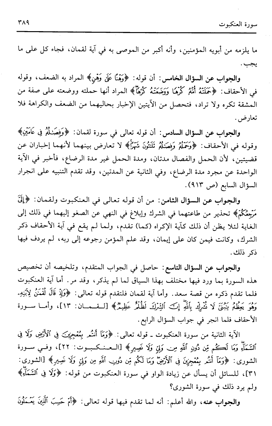 والجواب عن السؤال التاسع: حاصل في الجواب المتقدم، وتلخيصه أن تخصيص هذه السورة بما ورد فيها مختلف بهذا السياق لما لم يذكر، وقد مر. أما آية العنكبوت فلما تقدم ذكره من قصة سعد. وأما آية لقمان فلتقدم قوله تعالى: (وَإِذْ قَالَ لُقْمَانُ لِابْنِهِ وَهُوَ يَعِظُهُ يَا بُنَيَّ لَا تُشْرِكْ بِاللَّهِ إِنَّ الشِّرْكَ لَظُلْمٌ عَظِيمٌ) (لقمان: 13)، وأما سورة الأحقاف فلما انجر في جواب السؤال الرابع.