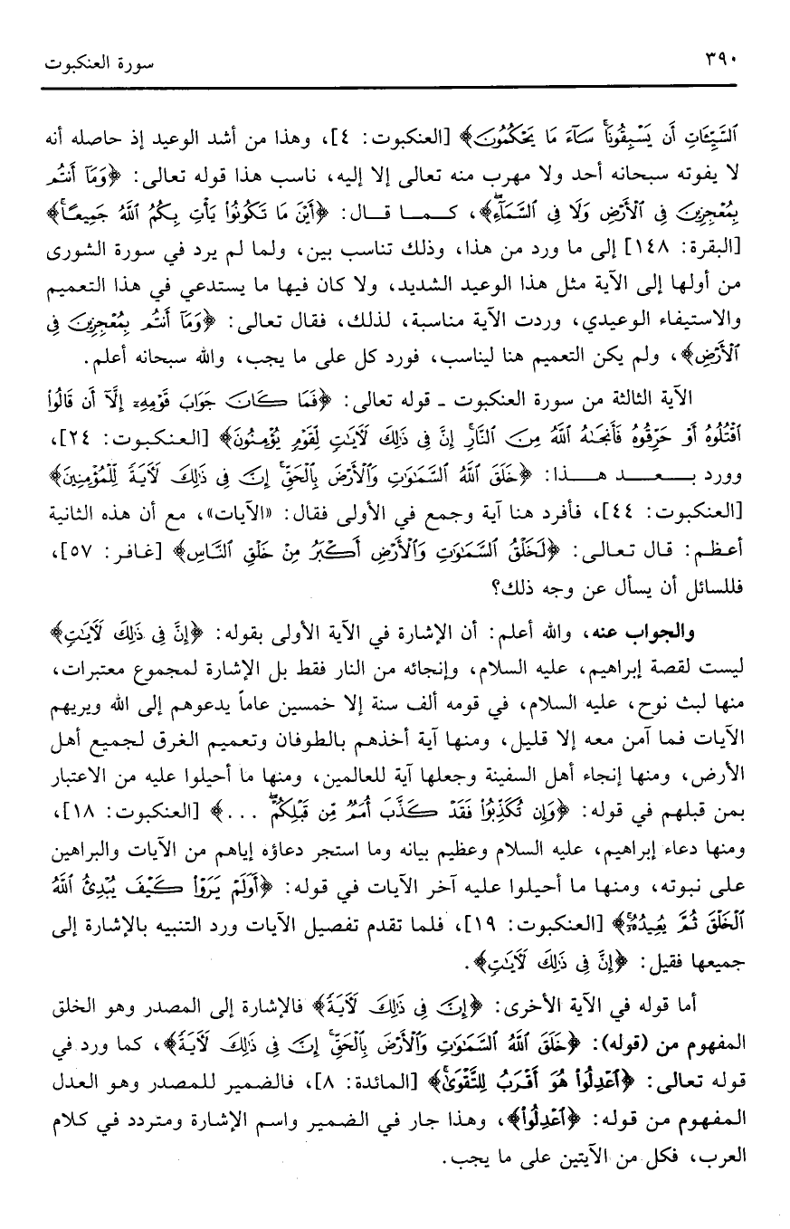 الآية الثالثة من سورة العنكبوت - قوله تعالى: (فَمَا كَانَ جَوَابَ قَوْمِهِ إِلَّا أَنْ قَالُوا اقْتُلُوهُ أَوْ حَرِّقُوهُ فَأَنْجَاهُ اللَّهُ مِنَ النَّارِ إِنَّ فِي ذَلِكَ لَآيَاتٍ لِقَوْمٍ يُؤْمِنُونَ) (العنكبوت: 24)، وورد بعد هذا: (خَلَقَ اللَّهُ السَّمَاوَاتِ وَالْأَرْضَ بِالْحَقِّ إِنَّ فِي ذَلِكَ لَآيَةً لِلْمُؤْمِنِينَ) (العنكبوت: 44)، فأفرد هنا آية وجمع في الأولى فقال: (الآيات)، مع أن هذه الثانية أعظم: قال تعالى: (لَخَلْقُ السَّمَاوَاتِ وَالْأَرْضِ أَكْبَرُ مِنْ خَلْقِ النَّاسِ) (غافر: 57)، فللسائل أن يسأل عن وجه ذلك؟