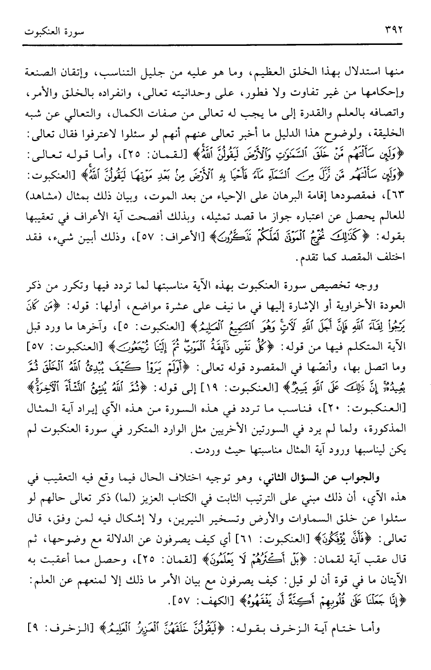منها استدلال بهذا الخلق العظيم، وما هو عليه من جليل التناسب، وإتقان الصنعة وإحكامها من غير تفاوت ولا فطور، على واحدانية تعالى، وانفراده بالخلق والأمر، واتصافه بالعلم والقدرة إلى ما يجب له تعالى من صفات الكمال، والتعالي عن شبه الخليقة، ولوضوح هذا الدليل ما أخبر تعالى عنهم أنهم لو سئلوا لاعترفوا فقال تعالى: (وَلَئِنْ سَأَلْتَهُمْ مَنْ خَلَقَ السَّمَاوَاتِ وَالْأَرْضَ لَيَقُولُنَّ اللَّهُ) (لقمان: 25)، وأما قوله تعالى: (وَلَئِنْ سَأَلْتَهُمْ مَنْ نَزَّلَ مِنَ السَّمَاءِ مَاءً فَأَحْيَا بِهِ الْأَرْضَ مِنْ بَعْدِ مَوْتِهَا لَيَقُولُنَّ اللَّهُ) (العنكبوت: 63)، فمقصودها إقامة البرهان على الإحياء من بعد الموت، وبيان ذلك بمثال (مشاهد) للعالم يحصل عن اعتباره جواز ما قصد تمثيله، وبذلك أفصحت آية الأعراف في تعقيبها بقوله: (كَذَلِكَ نُخْرِجُ الْمَوْتَى لَعَلَّكُمْ تَذَكَّرُونَ) (الأعراف: 57)، وذلك أبين شيء، فقد اختلف المقصد كما تقدم.