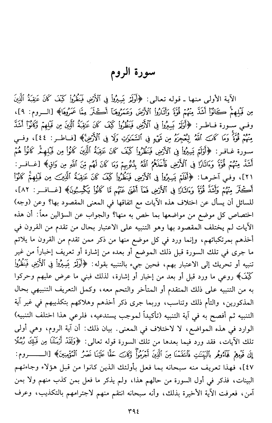 الآية الأولى منها - قوله تعالى: (أَوَلَمْ يَسِيرُوا فِي الْأَرْضِ فَيَنْظُرُوا كَيْفَ كَانَ عَاقِبَةُ الَّذِينَ مِنْ قَبْلِهِمْ كَانُوا أَشَدَّ مِنْهُمْ قُوَّةً وَأَثَارُوا الْأَرْضَ وَعَمَرُوهَا أَكْثَرَ مِمَّا عَمَرُوهَا) (الروم: 9)، وفي سورة فاطر: (أَوَلَمْ يَسِيرُوا فِي الْأَرْضِ فَيَنْظُرُوا كَيْفَ كَانَ عَاقِبَةُ الَّذِينَ مِنْ قَبْلِهِمْ وَكَانُوا أَشَدَّ مِنْهُمْ قُوَّةً وَمَا كَانَ اللَّهُ لِيُعْجِزَهُ مِنْ شَيْءٍ فِي السَّمَاوَاتِ وَلَا فِي الْأَرْضِ) (فاطر: 44)، وفي سورة غافر: (أَوَلَمْ يَسِيرُوا فِي الْأَرْضِ فَيَنْظُرُوا كَيْفَ كَانَ عَاقِبَةُ الَّذِينَ كَانُوا مِنْ قَبْلِهِمْ كَانُوا هُمْ أَشَدَّ مِنْهُمْ قُوَّةً وَآثَارًا فِي الْأَرْضِ فَأَخَذَهُمُ اللَّهُ بِذُنُوبِهِمْ وَمَا كَانَ لَهُمْ مِنَ اللَّهِ مِنْ وَاقٍ) (غافر: 21)، وفي آخرها: (أَفَلَمْ يَسِيرُوا فِي الْأَرْضِ فَيَنْظُرُوا كَيْفَ كَانَ عَاقِبَةُ الَّذِينَ مِنْ قَبْلِهِمْ كَانُوا أَكْثَرَ مِنْهُمْ وَأَشَدَّ قُوَّةً وَآثَارًا فِي الْأَرْضِ فَمَا أَغْنَى عَنْهُمْ مَا كَانُوا يَكْسِبُونَ) (غافر: 82)، للسائل أن يسأل عن اختلاف هذه الآيات مع اتفاقها في المعنى المقصود بها؟ وعن (وجه) اختصاص كل موضع من مواضعها بما خص به منها؟ والجواب عن السؤالين معاً: أن هذه الآيات لم يختلف المقصود بها وهو التنبيه على الاعتبار بحال من تقدم من القرون ما يلائم ما جرى في تلك السورة قبل ذلك الموضع أو بعده من إشارة أو تعريف إخباراً من غير تنبيه أو تحريك إلى الاعتبار بهم، فحين جيء بالتنبيه بقوله: (أَوَلَمْ يَسِيرُوا فِي الْأَرْضِ فَيَنْظُرُوا كَيْفَ) روعي ما ورد قبل أو بعد من إخبار أو إشارة، لذلك فبني ما عرض عليهم وحركوا به من التنبيه ثم أفصح به في آية التنبيه (تأكيداً لموجب يستدعيه، فلرعي هذا اختلف التنبيه) الوارد في هذه المواضع، لا لاختلاف في المعنى. بيان ذلك أن آية الروم، وهي أولى تلك الآيات، فقد ورد فيما بعدها من تلك السورة قوله تعالى: (وَلَقَدْ أَرْسَلْنَا مِنْ قَبْلِكَ رُسُلًا إِلَى قَوْمِهِمْ فَجَاءُوهُمْ بِالْبَيِّنَاتِ فَانْتَقَمْنَا مِنَ الَّذِينَ أَجْرَمُوا وَكَانَ حَقًّا عَلَيْنَا نَصْرُ الْمُؤْمِنِينَ) (الروم: 47)، فهذا تعريف منه سبحانه بما فعل بأولئك الذيم كانوا من قبل هؤلاء وجاءتهم البينات، فذكر في أول السورة من حالهم هذا، ولم يذكر ما فعل بمن كذب منهم ولا بمن آمن، فعرفت الآية الأخيرة بذلك، وأنه سبحانه انتقم منهم لاجترامهم بالتكذيب، وعرف