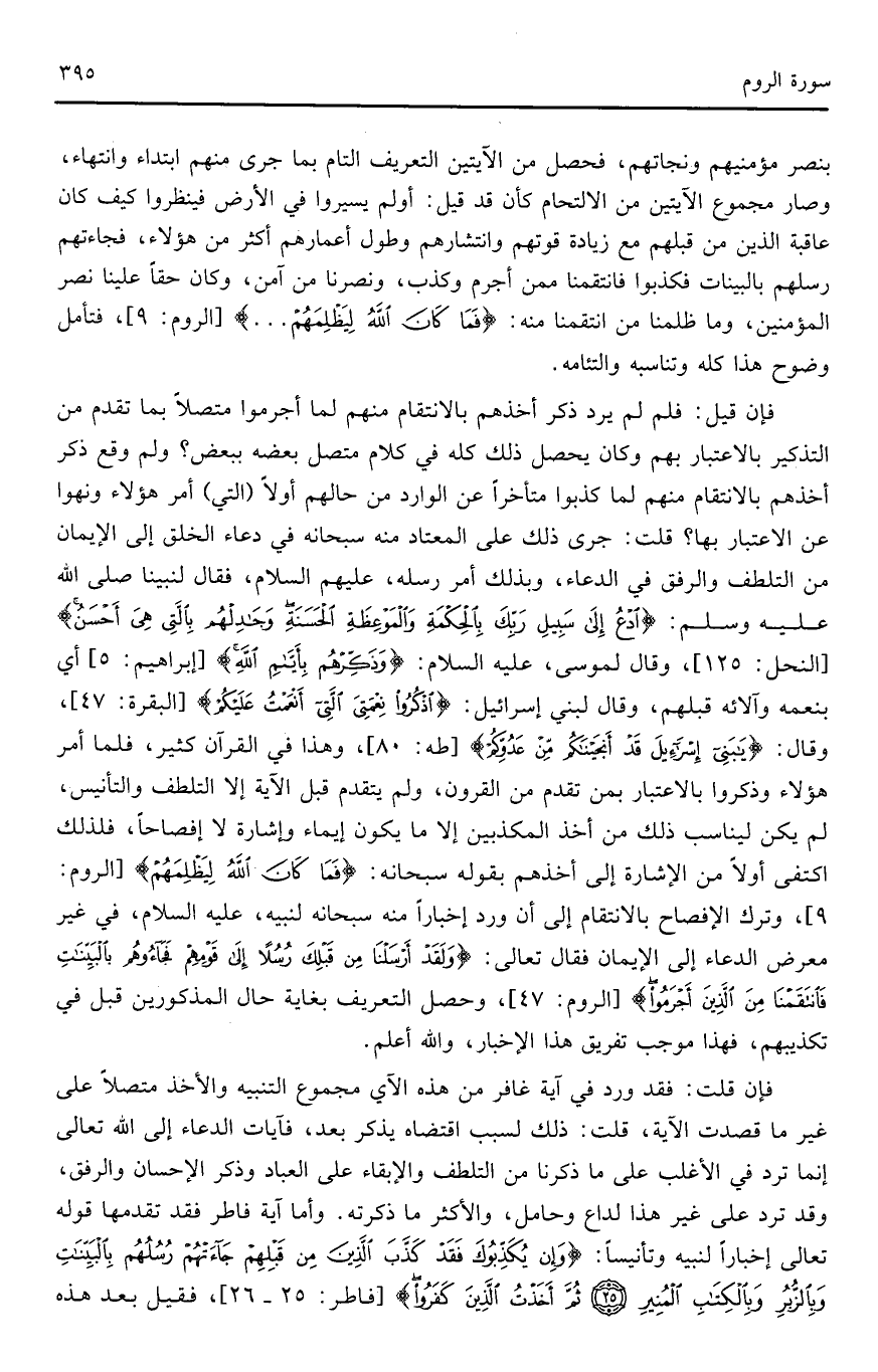 فإن قيل: فلم لم يرد ذكر أخذهم بالانتقام منهم لما أجرموا متصلاً بما تقدم من التذكير بالاعتبار بهم وكان يحصل ذلك كله في كلام متصل بعضه ببعض؟ ولم وقع ذكر أخذهم بالانتقام منهم لما كذبوا متأخراً عن الوارد من حالهم أولاً (التي) أمر هؤلاء ونهوا عن الاعتبار بها؟ قلت: جرى ذلك على المعتاد منه سبحانه في دعاء الخلق إلى الإيمان من التطلف والرفق في الدعاء، وبذلك أمر رسله، عليهم السلام، فقال لنبينا صلى الله عليه وسلم: (ادْعُ إِلَى سَبِيلِ رَبِّكَ بِالْحِكْمَةِ وَالْمَوْعِظَةِ الْحَسَنَةِ وَجَادِلْهُمْ بِالَّتِي هِيَ أَحْسَنُ) (النحل: 125)، وقال لموسى، عليه السلام: (وَذَكِّرْهُمْ بِأَيَّامِ اللَّهِ) (إبراهيم: 5) أي بنعمة وآلائه قبلهم، وقال لبني إسرائيل: (اذْكُرُوا نِعْمَتِيَ الَّتِي أَنْعَمْتُ عَلَيْكُمْ) (البقرة: 47)، وقال: (يَا بَنِي إِسْرَائِيلَ قَدْ أَنْجَيْنَاكُمْ مِنْ عَدُوِّكُمْ) (طه: 80)، وهذا في القرآن كثير، فلما أمر هؤلاء وذكروا بالاعتبار بمن تقدم من القرون، ولم يتقدم قبل الآية إلا التلطف والتأنيس، لم يكن ليناسب ذلك من أخذالمكذبين إلا ما يكون إيماء وإشارة لا إفصاحاً، فلذلك اكتفى أولاً من الإشارة إلى أخذهم بقوله سبحانه: (فَمَا كَانَ اللَّهُ لِيَظْلِمَهُمْ) (الروم: 9)، وترك الإفصاح بالانتقام إلى أن ورد إخباراً منه سبحانه لنبيه، عليه السلام، في غير معرض الدعاء إلى الإيمان فقال تعالى: (وَلَقَدْ أَرْسَلْنَا مِنْ قَبْلِكَ رُسُلًا إِلَى قَوْمِهِمْ فَجَاءُوهُمْ بِالْبَيِّنَاتِ فَانْتَقَمْنَا مِنَ الَّذِينَ أَجْرَمُوا) (الروم: 47)، وحصل التعريف بغاية حال المذكورين قبل في تكذيبهم، فهذا موجب تفريق هذا الإخبار، والله أعلم.