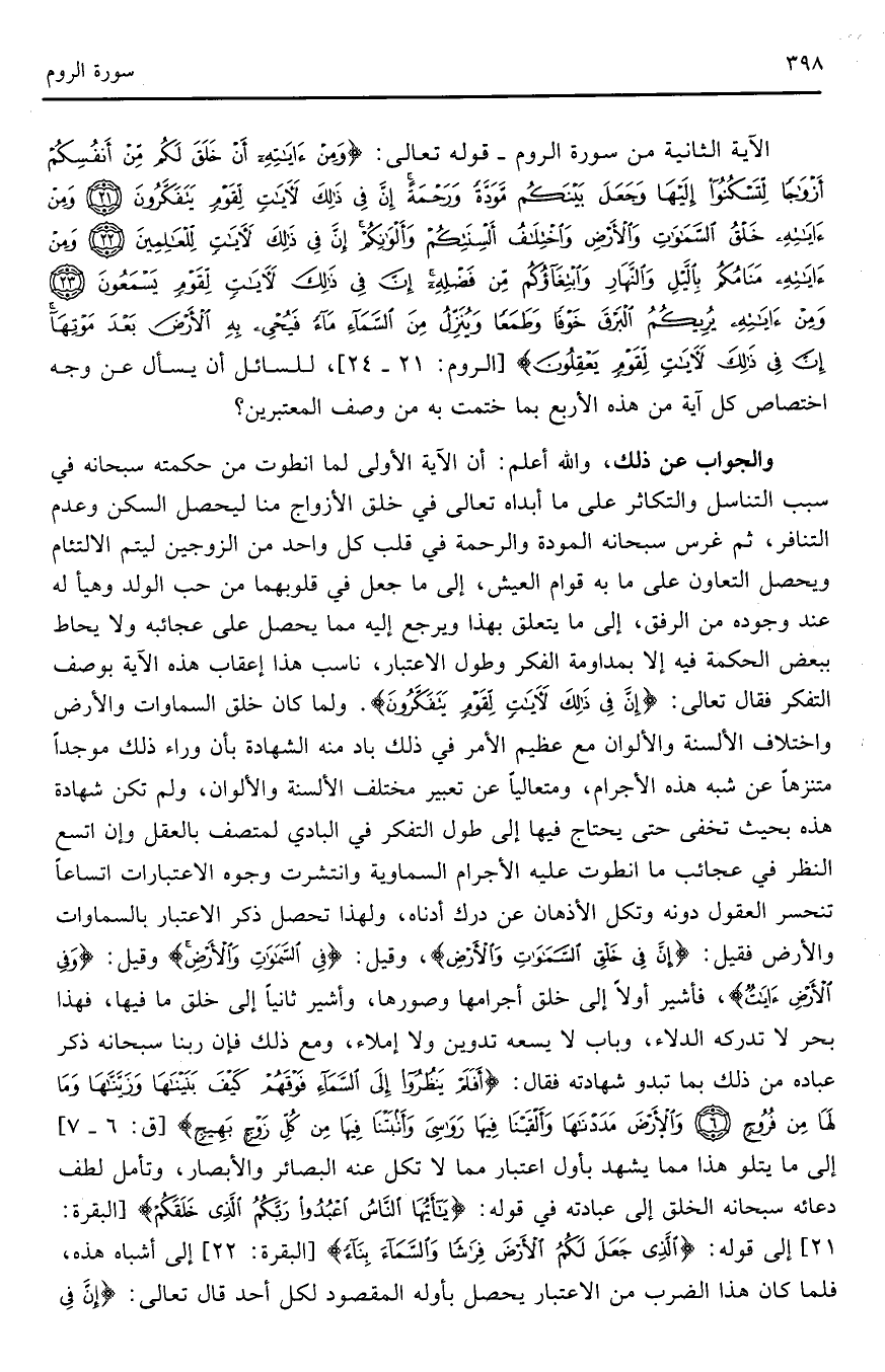 والجواب عن ذلك، والله أعلم: أن الآية الأولى لما انطوت من حكمته سبحانه في سبب التناسل والتكاثر على ما أبداه تعالى في خلق الأزواج منا ليحصل السكن وعدم التنافر، ثم غرس سبحانه المودة والرحمة في قلب كل واحد من الزوجين ليتم الالتئام ويحصل التعاون على ما به قوام العيش، إلى ما يتعلق بهذا ويرجع إليه مما يحصل على عجائبه ولا يحاط ببعض الحكمة فيه إلا بمداومة الفكر وطول الاعتبار، ناسب هذا إعقاب هذه الآية بوصف التفكر فقال تعالى: (إِنَّ فِي ذَلِكَ لَآيَاتٍ لِقَوْمٍ يَتَفَكَّرُونَ). ولما كان خلق السماوات والأرض واختلاف الألسنة والألوان مع عظيم الأمر في ذلك باد منه الشهادة بأن وراء ذلك موجداً متنزهاً عن شبه هذه الأجرام، ومتعالياً عن تعبير مختلف الألسنة والألوان، ولم تكن شهادة هذه بحيث تخفى حتى يحتاج فيها إلى طول التفكير في البادي لمتصف بالعقل وإن اتسع النظر في عجائب ما انطوت عليه الأجرام السماوية وانتشرت وجوه الاعتبارات اتساعاً تنحسر العقول دونه وتكل الأذهان عن درك أدناه، ولهذا تحصل ذكر الاعتبارات اتساعاً تنحسر العقول دونه وتكل الأذهان عن درك أدناه، ولهذا تحصل ذكر الاعتبار بالسماوات والأرض فقيل: (إِنَّ فِي خَلْقِ السَّمَاوَاتِ وَالْأَرْضِ) (البقرة: 164)، وقيل: (فِي السَّمَاوَاتِ وَالْأَرْضِ) (البقرة: 116)، وقيل: (وَفِي الْأَرْضِ آيَاتٌ) (الذاريات: 20)، فأشير أولاً إلى خلق أجرامها وصورها، وأشير ثانياً إلى خلق ما فيها، فهذا بحر لا تدركه الدلاء، وباب لا يسعه تدوين ولا إملاء، ومع ذلك فإن ربنا سبحانه ذكر عباده من ذلك بما تبدو شهادته فقال: (أَفَلَمْ يَنْظُرُوا إِلَى السَّمَاءِ فَوْقَهُمْ كَيْفَ بَنَيْنَاهَا وَزَيَّنَّاهَا وَمَا لَهَا مِنْ فُرُوجٍ * وَالْأَرْضَ مَدَدْنَاهَا وَأَلْقَيْنَا فِيهَا رَوَاسِيَ وَأَنْبَتْنَا فِيهَا مِنْ كُلِّ زَوْجٍ بَهِيجٍ) (ق: 6 - 7) إلى ما يتلو هذا مما يشهد بأول اعتبار مما لاتكل عنه البصائر والأبصار، وتأمل لطف دعائه سبحانه الخلق إلى عبادته في قوله: (يَا أَيُّهَا النَّاسُ اعْبُدُوا رَبَّكُمُ الَّذِي خَلَقَكُمْ) (البقرة: 21) إلى قوله: (الَّذِي جَعَلَ لَكُمُ الْأَرْضَ فِرَاشًا وَالسَّمَاءَ بِنَاءً) (البقرة: 22) إلى أشباه هذه، فلما كان هذا الضرب من الاعتبار يحصل بأوله المقصود لكل أحد قال تعالى: (إِنَّ فِي