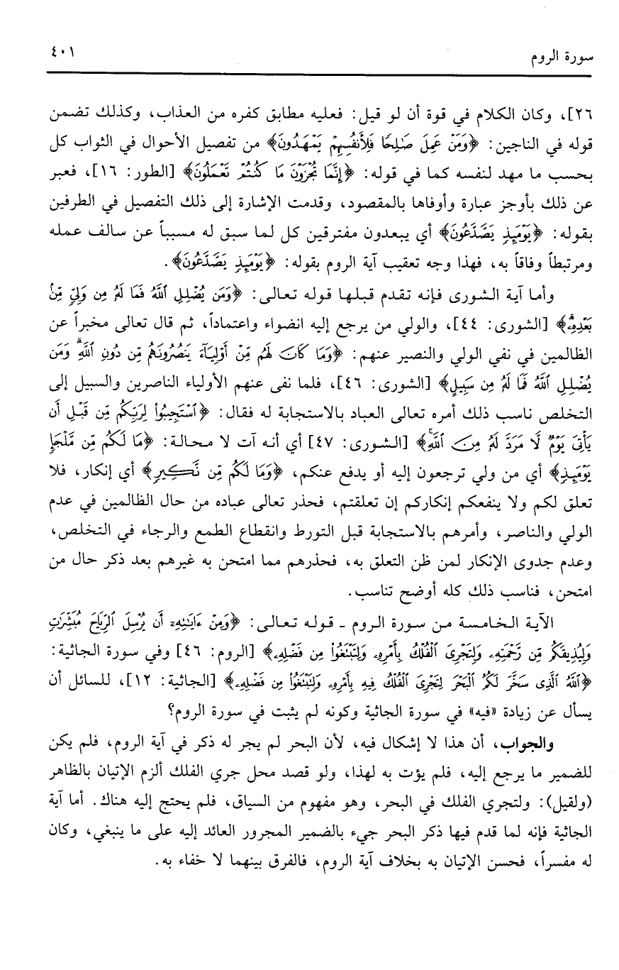 والجواب، أن هذا لا إشكال فيه، لأن البحر لم يجر له ذكر في آية الروم، فلم يكن للضمير ما يرجع إليه، فلم يؤت به بهذا، ولو قصد محل جري الفلك ألزم الإتيان بالظاهر (ولقيل): ولتجري الفلك في البحر، وهو مفهوم من السياق، فلم يحتج إليه هناك. أما آية الجاثية فإنه لما قدم فيها ذكر البحر جيء بالضمير المجرور العائد إليه على ما ينبغي، وكان له مفسراً، فحسن الإتيان به بخلاف آية الروم، فالفرق بينهما لا خفاء به.