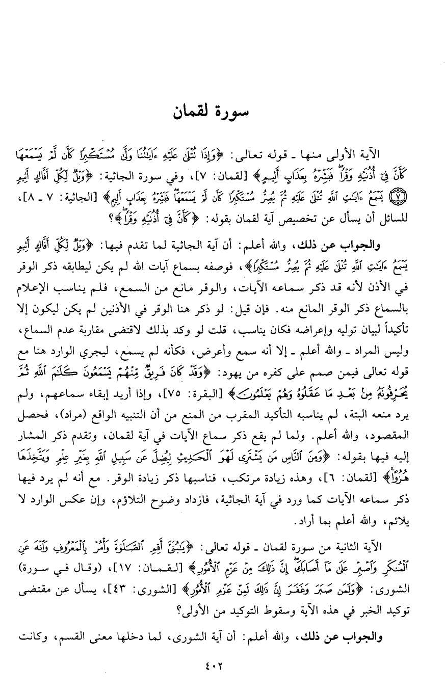 الآية الأولى منها - قوله تعالى: (وَإِذَا تُتْلَى عَلَيْهِ آيَاتُنَا وَلَّى مُسْتَكْبِرًا كَأَنْ لَمْ يَسْمَعْهَا كَأَنَّ فِي أُذُنَيْهِ وَقْرًا فَبَشِّرْهُ بِعَذَابٍ أَلِيمٍ) (لقمان: 7)، وفي سورة الجاثية: (وَيْلٌ لِكُلِّ أَفَّاكٍ أَثِيمٍ * يَسْمَعُ آيَاتِ اللَّهِ تُتْلَى عَلَيْهِ ثُمَّ يُصِرُّ مُسْتَكْبِرًا كَأَنْ لَمْ يَسْمَعْهَا فَبَشِّرْهُ بِعَذَابٍ أَلِيمٍ) (الجاثية: 7، 8) للسائل أن يسأل عن تخصيص آية لقمان بقوله: (كَأَنَّ فِي أُذُنَيْهِ وَقْرًا)؟