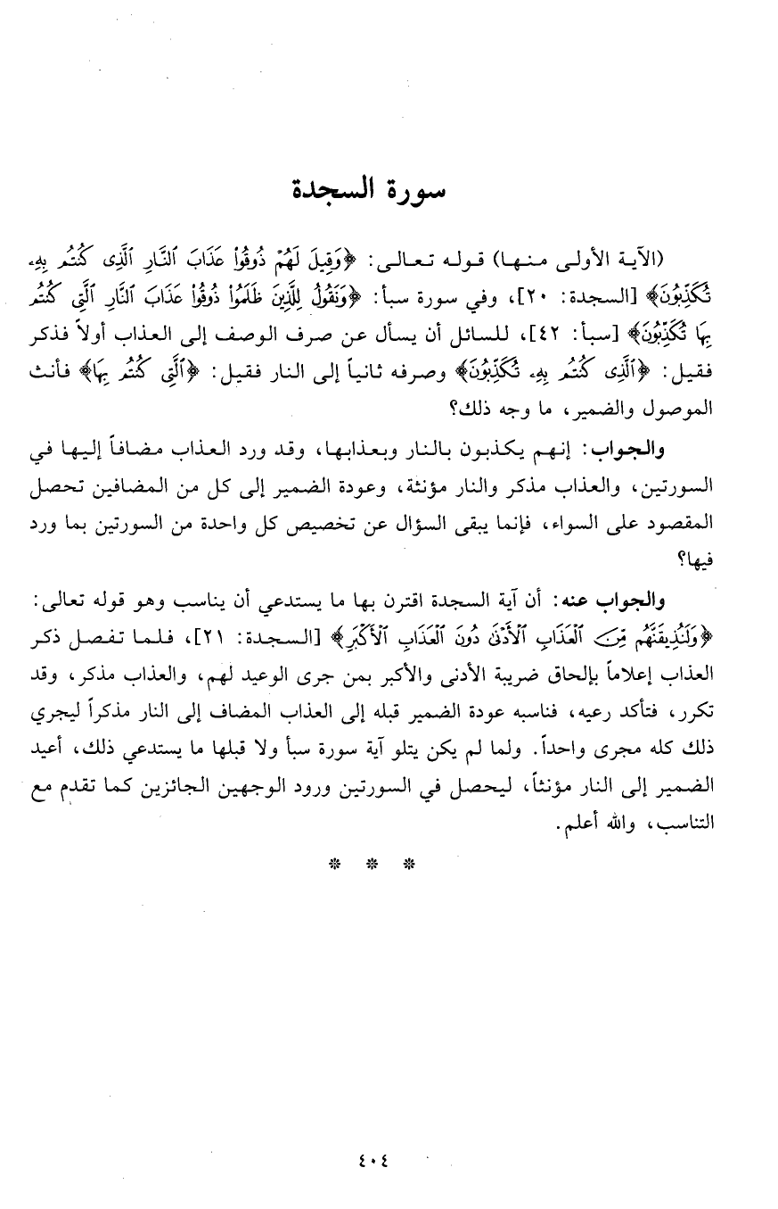 والجواب عنه: أن آية السجدة اقترن بها ما يستدعي أن يناسب وهو قوله تعالى: (وَلَنُذِيقَنَّهُمْ مِنَ الْعَذَابِ الْأَدْنَى دُونَ الْعَذَابِ الْأَكْبَرِ) (السجدة: 21)، فلما تفصل ذكر العذاب إعلاماً بإلحاق ضريبة الأدنى والأكبر بمن جرى الوعيد لهم، والعذاب مذكر، وقد تكرر، فتأكد رعيه، فناسبه عودة الضمير قبله إلى العذاب المضاف إلى النار مذكراً ليجري ذلك كله مجرى واحداً. ولما لم يكن يتلو آية سورة سبأ ولا قبلها ما يستدعي ذلك، أعيد الضمير إلى النار مؤنثاً، ليحصل في السورتين ورود الوجهين الجائزين كما تقدم مع التناسب، والله أعلم.