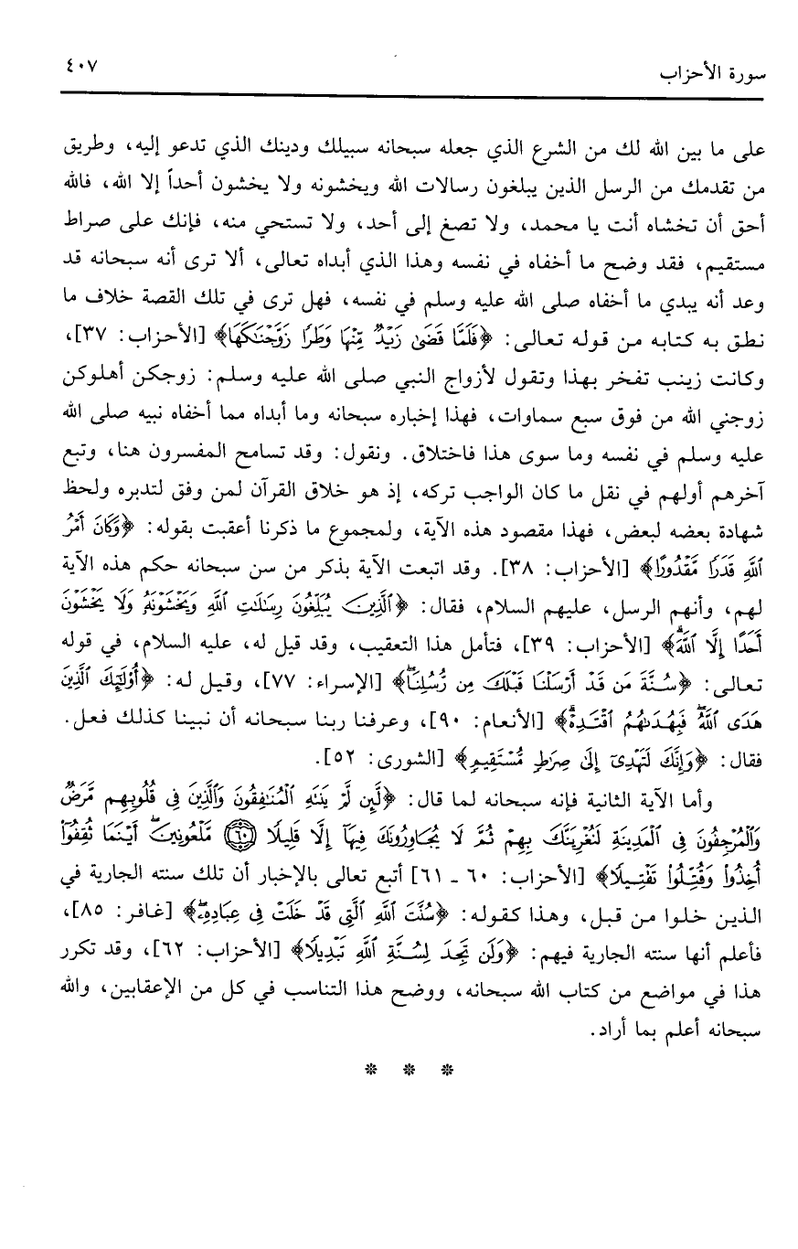 على ما بين الله لك من الشرع الذي جعله سبحانه سبيلك ودينك الذي تدعو إليه، وطريق من تقدمك من الرسل الذين يبلغون رسالات الله ويخشوننه ولا يخشون أحداً إلا الله، فالله أحق أن تخشاه أنت يا محمد، ولا تصغ إلى أحد، ولا تستحي منه، فإنك على صراط مستقيم، فقد وضح ما أخفاه في نفسه وهذا الذي أبداه تعالى، ألا ترى أنه سبحانه قد وعد أنه يبدي ما أخفاه صلى الله عليه وسلم في نفسه، فهل ترى في تلك القصة خلاف ما نطق به كتابه من قوله تعالى: (فَلَمَّا قَضَى زَيْدٌ مِنْهَا وَطَرًا زَوَّجْنَاكَهَا) (الأحزاب: 37)، وكانت زينب تفخر بهذا وتقول لأزواج النبي صلى الله عليه وسلم: زوجكن أهلوكن زوجني الله من فوق سبع سماوات، فهذا إخباره سبحانه وما أبداه مما أخفاه نبيه صلى الله عليه وسلم في نفسه وما سوى هذا فاختلاق. ونقول: وقد تسامح المفسرون هنا، وتبع آخرهم أولهم في نقل ما كان الواجب تركه، إذ هو خلاق القرآن لمن وفق لتدبره ولحظ شهادة بعضه لبعض، فهذا مقصود هذه الآية، ولمجموع ما ذكرنا أعقبت بقوله: (وَكَانَ أَمْرُ اللَّهِ قَدَرًا مَقْدُورًا) (الأحزاب: 38). وقد اتبعت الآية بذكر من سن سبحانه حكم هذه الآية لهم، وأنهم الرسل، عليه السلام، فقال: (الَّذِينَ يُبَلِّغُونَ رِسَالَاتِ اللَّهِ وَيَخْشَوْنَهُ وَلَا يَخْشَوْنَ أَحَدًا إِلَّا اللَّهَ) (الأحزاب: 39)، فتأمل هذا التعقيب، وقد قيل له، عليه السلام، في قوله تعالى: (سُنَّةَ مَنْ قَدْ أَرْسَلْنَا قَبْلَكَ مِنْ رُسُلِنَا) (الإسراء: 77)، وقيل له: (أُولَئِكَ الَّذِينَ هَدَى اللَّهُ فَبِهُدَاهُمُ اقْتَدِهْ) (الأنعام: 90)، وعرفنا ربنا سبحانه أن نبينا كذلك فعل فقال: (وَإِنَّكَ لَتَهْدِي إِلَى صِرَاطٍ مُسْتَقِيمٍ) (الشورى: 52).