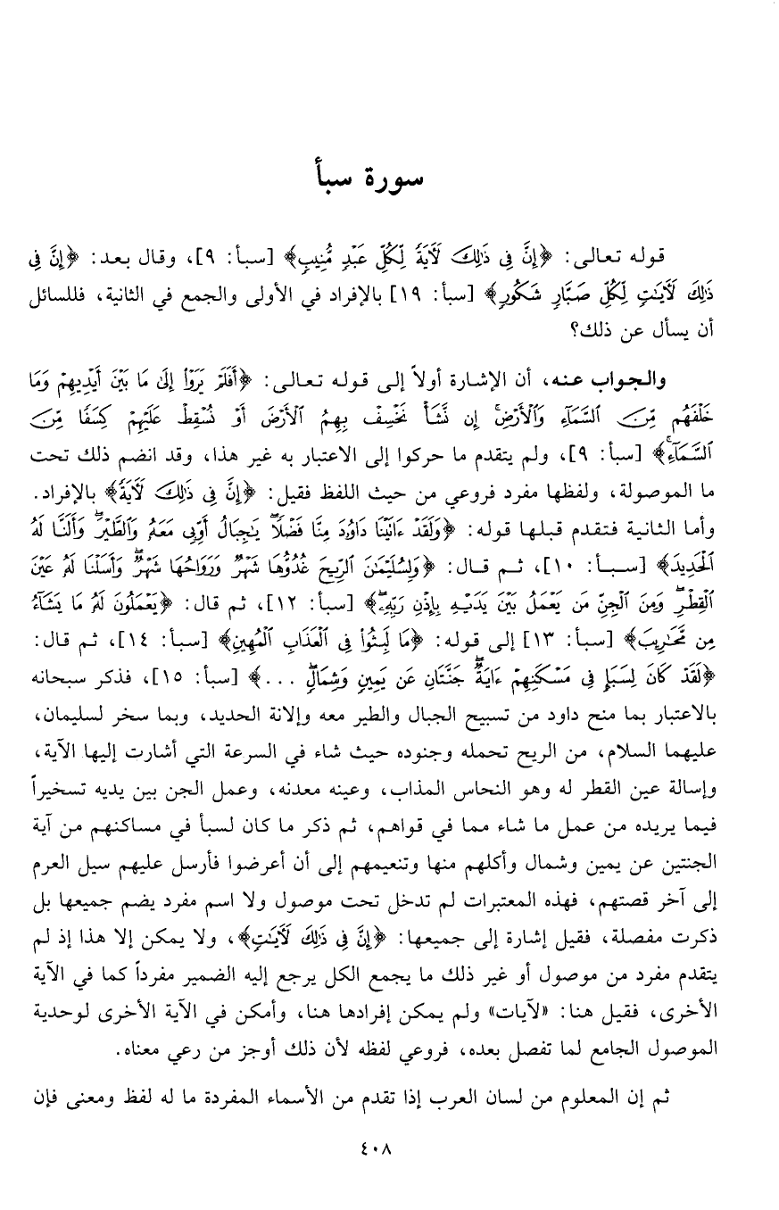 والجواب عنه، أن الإشارة أولاً إلى قوله تعالى: (أَفَلَمْ يَرَوْا إِلَى مَا بَيْنَ أَيْدِيهِمْ وَمَا خَلْفَهُمْ مِنَ السَّمَاءِ وَالْأَرْضِ إِنْ نَشَأْ نَخْسِفْ بِهِمُ الْأَرْضَ أَوْ نُسْقِطْ عَلَيْهِمْ كِسَفًا مِنَ السَّمَاءِ) (سبأ: 9)، ولم يتقدم ما حركوا إلأى الاعتبار به غير هذا، وقد انضم ذلك تحت ما الموصولة، ولفظها مفرد فروعي من حيث اللفظ فقيل: (إِنَّ فِي ذَلِكَ لَآيَةً) بالإفراد. وأما الثانية فتقدم قبلها قوله: (وَلَقَدْ آتَيْنَا دَاوُودَ مِنَّا فَضْلًا يَا جِبَالُ أَوِّبِي مَعَهُ وَالطَّيْرَ وَأَلَنَّا لَهُ الْحَدِيدَ) (سبأ: 10)، ثم قال: (وَلِسُلَيْمَانَ الرِّيحَ غُدُوُّهَا شَهْرٌ وَرَوَاحُهَا شَهْرٌ وَأَسَلْنَا لَهُ عَيْنَ الْقِطْرِ وَمِنَ الْجِنِّ مَنْ يَعْمَلُ بَيْنَ يَدَيْهِ بِإِذْنِ رَبِّهِ) (سبأ: 12)، ثم قال: (يَعْمَلُونَ لَهُ مَا يَشَاءُ مِنْ مَحَارِيبَ) (سبأ: 13) إلى قوله: (مَا لَبِثُوا فِي الْعَذَابِ الْمُهِينِ) (سبأ: 14)، ثم قال: (لَقَدْ كَانَ لِسَبَإٍ فِي مَسْكَنِهِمْ آيَةٌ جَنَّتَانِ عَنْ يَمِينٍ وَشِمَالٍ .... ) (سبأ: 15)، فذكر سبحانه بالاعتبار بما منح داود من تسبيح الجبال والطير معه وإلانة الحديد، وبما سخر لسيلمان، عليهما السلام، من الريح تحمله وجنوده حيث شاء في السرعة التي أشارت إليها الآية، وإسالة عين القطر له وهو النحاس المذاب، وعينه معدنه، وعمل الجن بين يديه تسخيراً فيما يريده من عمل ما شاء مما في قواهم، ثم ذكر ما كان لسبأ في مساكنهم من آية الجنتين عن يمين وشمال وأكلهم منها وتنعيمهم إلى أن أعرضوا فأرسل عليهم سيل العرم إلى آخر قصتهم، فهذه المعتبرات لم تدخل تحت موصول ولا اسم مفرد يضم جميعها بل ذكرت مفصلة، فقيل إشارةإلى جميعهما: (إِنَّ فِي ذَلِكَ لَآيَاتٍ)، ولا يمكن إلا هذا إذ لم يتقدم مفرد من موصول أو غيرذلك ما يجمع الكل يرجع إليه الضمير مفرداً كما في الآية الأخرى، فقيل هنا: (لآيات) ولم يمكن إفرادها هنا، وأمكن في الآية الأخرى لوحدية الموصول الجامع لما تفصل بعده، فروعي لفظه لأن ذلك أوجز من رعي معناه.
