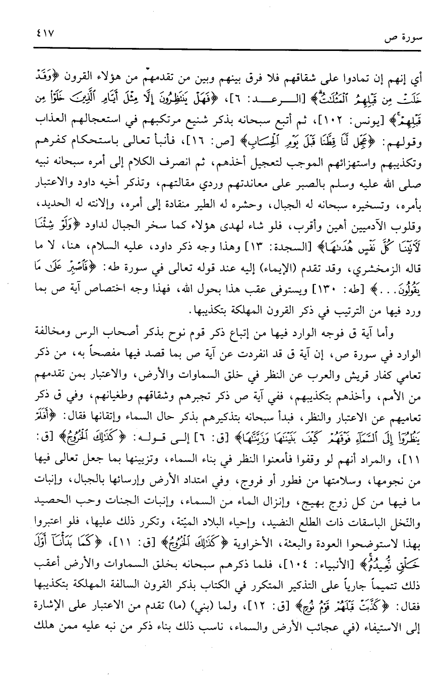 أي إنهم إن تمادوا على شقاقهم فلا فرق بينهم وبين ما تقدمهم من هؤلاء القرون (وَقَدْ خَلَتْ مِنْ قَبْلِهِمُ الْمَثُلَاتُ) (الرعد: 6)، (فَهَلْ يَنْتَظِرُونَ إِلَّا مِثْلَ أَيَّامِ الَّذِينَ خَلَوْا مِنْ قَبْلِهِمْ) (يونس: 102)، ثم أتبع سبحانه بذكر شنيع مرتكبهم في استعجالهم العذاب وقولهم: (عَجِّلْ لَنَا قِطَّنَا قَبْلَ يَوْمِ الْحِسَابِ) (ص: 16)، فأنبأ تعالى باستحكام كفرهم وتكذبيهم واستهزائهم الموجب لتعجيل أخذهم، ثم أنصرف الكلام إلى أمره سبحانه نبيه صلى الله عليه وسلم بالصبر على معاندتهم وردي مقالتهم، وتذكر أخيه داود والاعتبار بأمره، وتسخيره سبحانه له الجبال، وحشره له الطير منقادة إلى أمره، وإلانته له الحديد، وقلوب الآدميين أهين وأقرب، فلو شاء لهدى هؤلاء كما سخر الجبال لداود (وَلَوْ شِئْنَا لَآتَيْنَا كُلَّ نَفْسٍ هُدَاهَا) (السجدة: 13) وهذا وجه ذكر داود، عليه السلام، هنا، لا ما قاله الزمخشري، وقد تقدم (الإيماء) إليه عند قوله تعالى في سورة طه: (فَاصْبِرْ عَلَى مَا يَقُولُونَ) (طه: 130) ويستوفي عقب هذا بحول الله، فهذا وجه اختصاص آية ص بما ورد فيها من الترتيب في ذكر القرون المهلكة بتكذيبها.