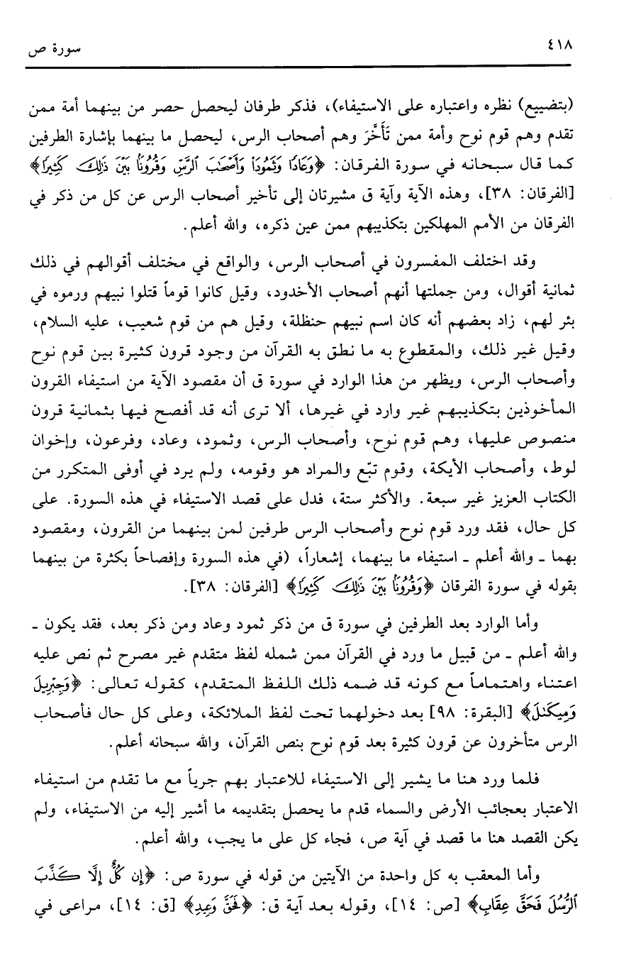 (بتضييع) نظره واعتباره على الاستيفاء)، فذكر طرفان ليحصل حصر من بينهما أمة ممن تقدم وهم قوم نوح وأمة ممن تأخر وهم أصحاب الرس، ليحصل ما بينهما بإشارة الطرفين كما قال سبحانه في سورة الفرقان: (وَعَادًا وَثَمُودَ وَأَصْحَابَ الرَّسِّ وَقُرُونًا بَيْنَ ذَلِكَ كَثِيرًا) (الفرقان: 38)، وهذه الآية وآية ق مشيرتان إلى تأخير أصحاب الرس عن كل من ذكر في الفرقان من الأمم المهلكين بتكذيبهم ممن عين ذكره، والله أعلم.