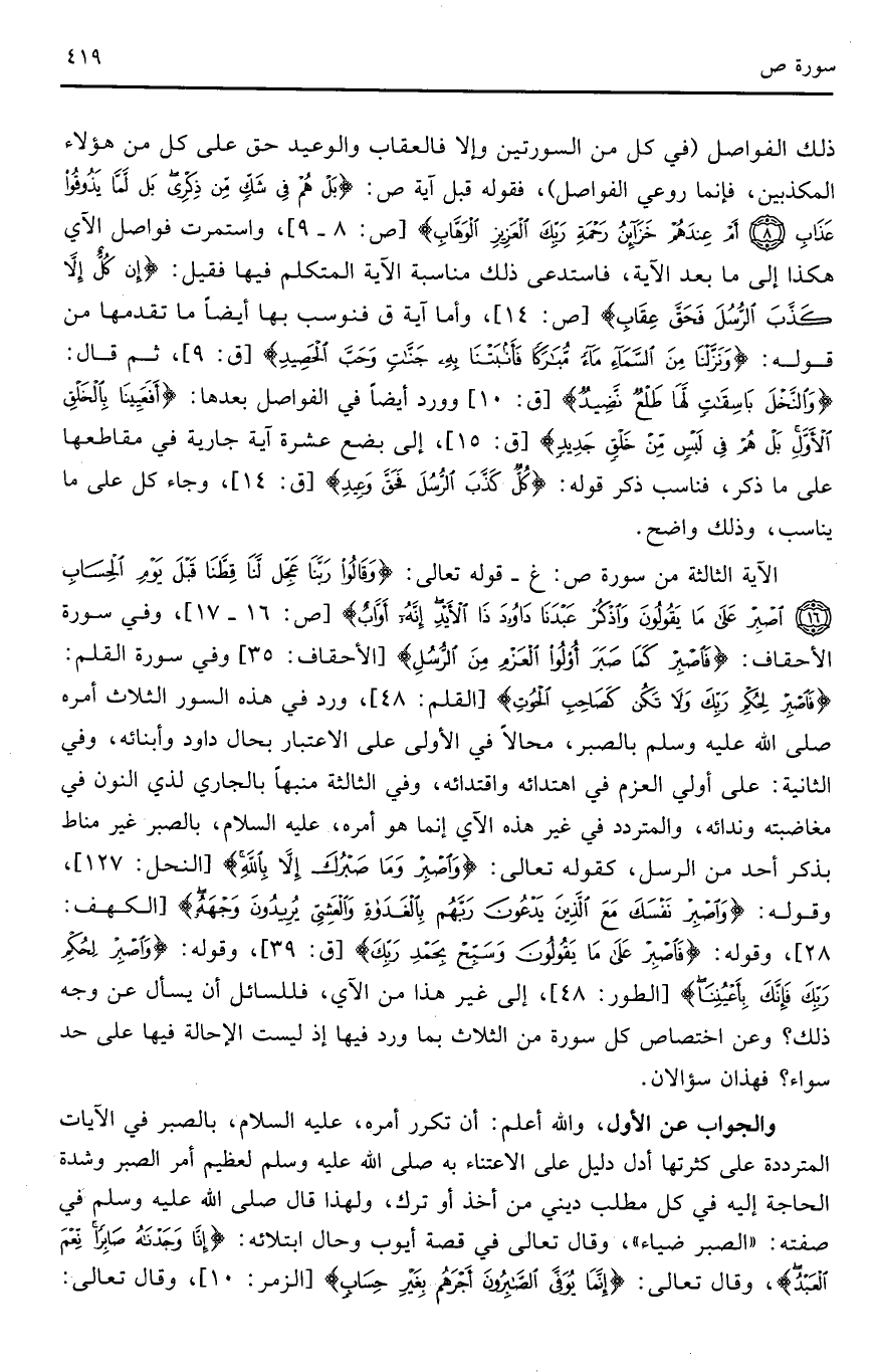 الآية الثالثة من سورة ص: غ - قوله تعالى: (وَقَالُوا رَبَّنَا عَجِّلْ لَنَا قِطَّنَا قَبْلَ يَوْمِ الْحِسَابِ *اصْبِرْ عَلَى مَا يَقُولُونَ وَاذْكُرْ عَبْدَنَا دَاوُودَ ذَا الْأَيْدِ إِنَّهُ أَوَّابٌ) (ص: 16 - 17) وفي سورة الأحقاف: (فَاصْبِرْ كَمَا صَبَرَ أُولُو الْعَزْمِ مِنَ الرُّسُلِ) (الأحقاف: 35) وفي سورة القلم: (فَاصْبِرْ لِحُكْمِ رَبِّكَ وَلَا تَكُنْ كَصَاحِبِ الْحُوتِ) (القلم: 48)، ورد في هذه السور الثلاث أمره صلى الله عليه وسلم بالصبر، محالا في الأولى عل الاعتبار بحال داود وأبنائه وفي الثانية: على أولي العزم في أهتدائه وأقتدائه، وفي الثالثة منبهاً بالجار لذي النون في مغاضبته وندائه، والمتردد في غير هذه الآي إنما هو أمره، عليه السلام، فاصبر غير مناط بذكر أحد من الرسل، كقوله تعالى: (وَاصْبِرْ وَمَا صَبْرُكَ إِلَّا بِاللَّهِ) (النحل: 127)، وكقوله: (وَاصْبِرْ نَفْسَكَ مَعَ الَّذِينَ يَدْعُونَ رَبَّهُمْ بِالْغَدَاةِ وَالْعَشِيِّ يُرِيدُونَ وَجْهَهُ) (الكهف: 28)، وقوله: (فَاصْبِرْ عَلَى مَا يَقُولُونَ وَسَبِّحْ بِحَمْدِ رَبِّكَ) (ق: 39)، وقوله: (وَاصْبِرْ لِحُكْمِ رَبِّكَ فَإِنَّكَ بِأَعْيُنِنَا) (الطور: 48)، إلى غير هذا من الآي، فللسال أن يسأل عن وجه ذلك؟ وعن اختصاص كل سورة من الثلاث بما ورد فيها إذ ليست الإحالة فيها على حد سواء؟ فهذان سؤالان.
