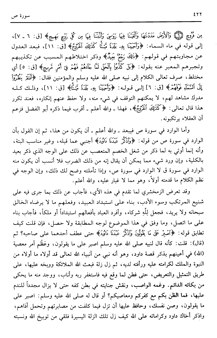 مِنْ فُرُوجٍ (6) وَالْأَرْضَ مَدَدْنَاهَا وَأَلْقَيْنَا فِيهَا رَوَاسِيَ وَأَنْبَتْنَا فِيهَا مِنْ كُلِّ زَوْجٍ بَهِيجٍ) (ق: 6 - 7) إلى قوله في ماء السماء: (وَأَحْيَيْنَا بِهِ بَلْدَةً مَيْتًا كَذَلِكَ الْخُرُوجُ) (ق: 11)، فبعد العدول عن جوابتهم في قولهم: (ذَلِكَ رَجْعٌ بَعِيدٌ) وذكر اختلاطهم المسبب عن تكذيبهم وتجبرهم المعبر عنهم بقوله: (بَلْ كَذَّبُوا بِالْحَقِّ لَمَّا جَاءَهُمْ فَهُمْ فِي أَمْرٍ مَرِيجٍ) (ق: 5) أي مختلط، صرف تعالى الكلام إلي نبيه صلى الله عليه وسلم والمؤمنين فقال: (أَفَلَمْ يَنْظُرُوا إِلَى السَّمَاءِ فَوْقَهُمْ) (ق: 6) إلى قوله: (وَأَحْيَيْنَا بِهِ بَلْدَةً مَيْتًا) (ق: 11) وذلك كله مدرك مشاهد لهم، لا يمكنه التوقف في شيء منه، ولا حفظ عنهم إنكاره، فعند تكرر هذا قال تعالى: (كَذَلِكَ الْخُرُوجُ) فهذا - والله أعلم - أقرب فيما ذكره أبو الفضل فزعم أن العقلاء يرتكبونه.