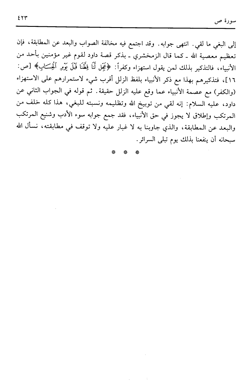 إلى البغي ما لقي. انتهى جوابه. وقد اجتمع فيهم مخالفة الصواب والبعد عن المطابقة فإن تعظيم معصية الله، كما قال الزمخشري - فذكر قصة داود لقوم غير مؤمنين بأحد من الأنبياء فالتذكير بذلك لمن يقول استهزاء وكفراً: (عَجِّلْ لَنَا قِطَّنَا قَبْلَ يَوْمِ الْحِسَابِ) (ص: 16) فتذكيرهم بهذا مع ذكر الأنبياء بلفظ الذلل أقرب شيء لاستمرارهم على الاستهذاء (والكفر) مع عصمة الأنبياء عما وقع عليه الذلل حقيقة. ثم قوله في الجواب الثاني عن داود، عليه السلام: أنه لقي من توبيخ الله وتظليمه ونسبته للبغي، هذا كله خلف من المرتكب واطلاق لا يجوز في حق الأنبياء، فقد جمع جوابه سوء الادب وشنيع المرتكب والبعد عن المطابقة، والذي جوابنا به لا غبار عليه ولا توقف في مطابقته، نسأل الله سبحانه أن ينفعنا بذلك يوم تبلى السرائر.