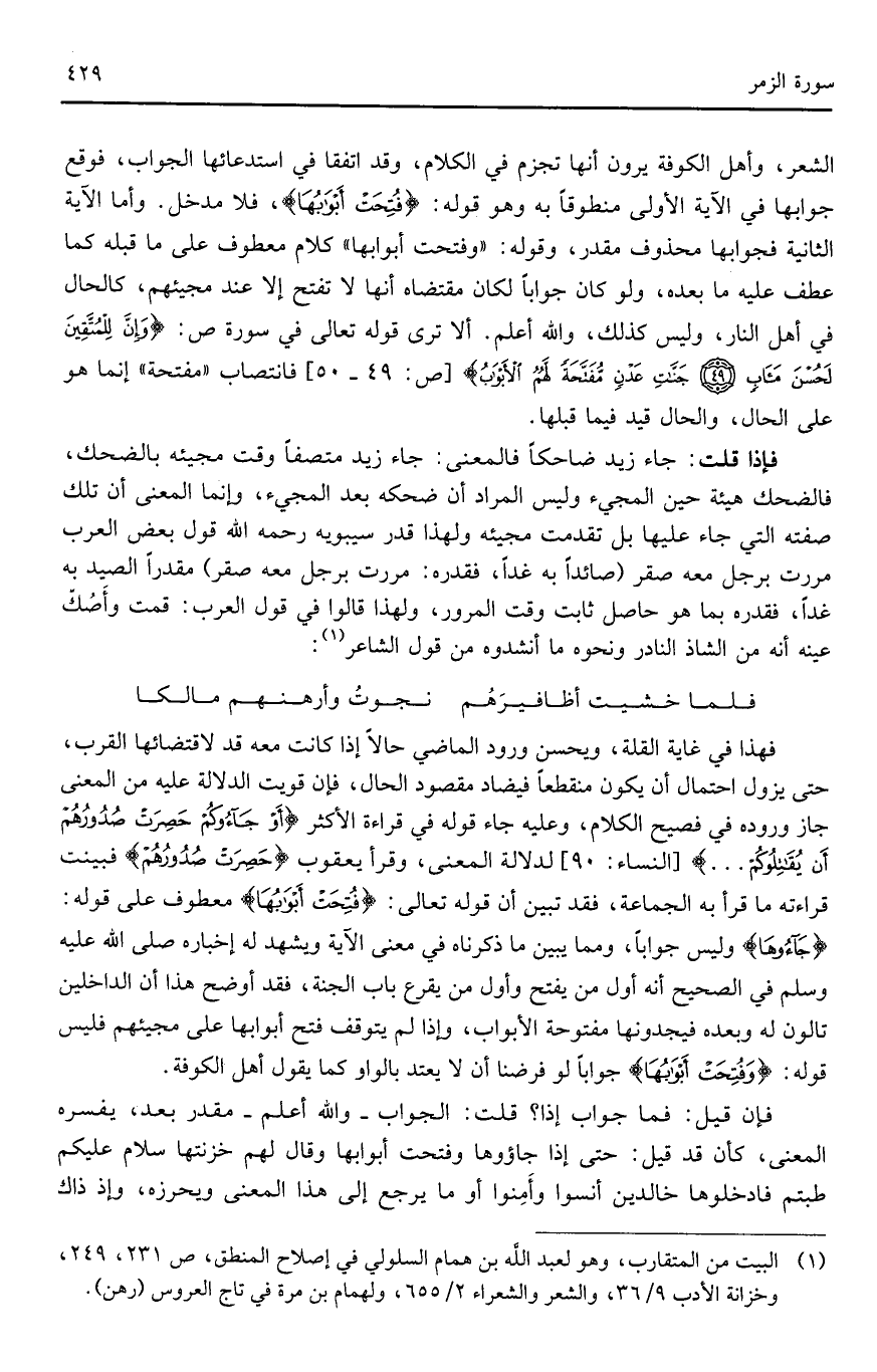الشعر، وأهل الكوفة يرون أنها تجزم في الكلام، وقد اتفقنا في استدعائها الجواب، فوقع جوابها في الآية الأولى منطوقاً به وهو قوله: (فُتِحَتْ أَبْوَابُهَا)، فلا مدخل. وأما الآية الثانية فجوابها محذوف مقدر، وقوله: (وَفُتِحَتْ أَبْوَابُهَا) كلام معطوف على ما قبله كما عطف عليه ما بعده، ولو كان جواباً لكان مقتضاه أنها لا تفتح إلا عند مجيئهم، كالحال في أهل النار، وليس كذلك، والله أعلم. ألا ترى قوله تعالى في سورة ص: (هَذَا ذِكْرٌ وَإِنَّ لِلْمُتَّقِينَ لَحُسْنَ مَآبٍ * جَنَّاتِ عَدْنٍ مُفَتَّحَةً لَهُمُ الْأَبْوَابُ) (ص: 49 - 50) فانتصاب (مفتحة) إنما هو على الحال، والحال قيد فيما قبلها.