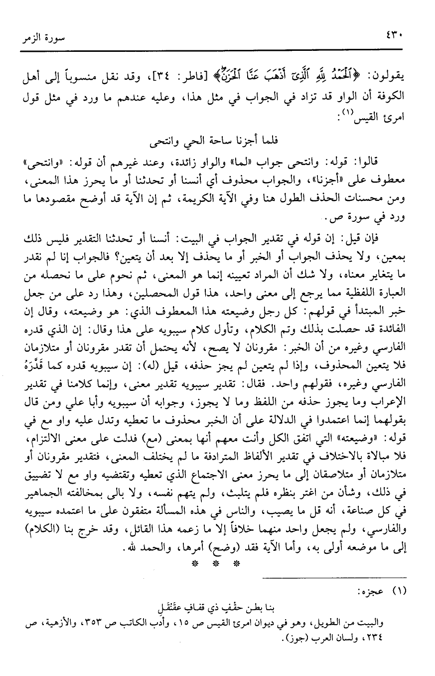 يقولون: (الْحَمْدُ لِلَّهِ الَّذِي أَذْهَبَ عَنَّا الْحَزَنَ) (فاطر: 34)، وقد نقل منسوباً إلى أهل الكوفة أن الواو قد تزاد في الجواب في مثل هذا، وعليه عندهم ما ورد في مثل قول امرئ القيس: