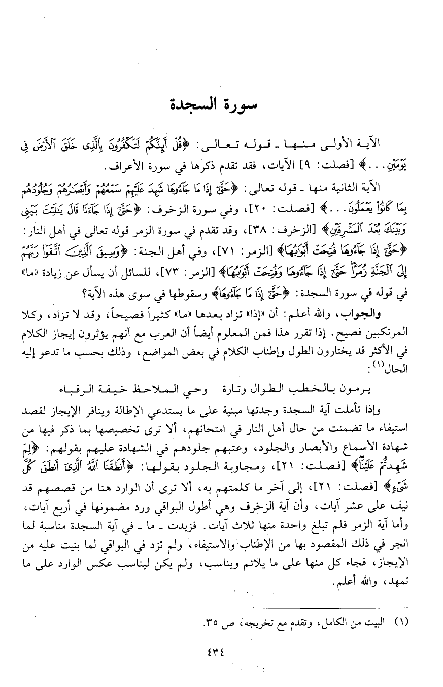 وإذا تأملت آية السجدة وجدتها مبنية على ما يستدعي الإطالة وينافر الإيجاز لقصد استيفاء ما تضمنت من حال أهل النار في امتحانهم، ألا ترى تخصيصها بما ذكر فيها من شهادة الأسماع والأبصار والجلود، وعتبهم جلودهم في الشهادة عليهم بقولهم: (لِمَ شَهِدْتُمْ عَلَيْنَا) (فصلت: 21، ومجاوبة الجلود بقولها: (أَنْطَقَنَا اللَّهُ الَّذِي أَنْطَقَ كُلَّ شَيْءٍ) (فصلت: 21)، إلى آخر ما كلمتهم به، ألا ترى أن الوارد هنا من قصصهم قد نيف على عشر آيات، وأن آية الزخرف وهي أطول البواقي ورد مضمونها في أربع آيات، وأما آية الزمر فلم تبلغ واحدة منها صلاص آيات. فزيدت - ما - في آي السجدة مناسبة لما انجر في ذلك المقصود بها من الإطناب والالستيفاء، ولم تزد في البواقي لما بنيت عليه من الإيجاز، فجاء كل منها على ما يلائم ويناسب، ولم يكن ليناسب عكس الوارد على ما تمهد، والله أعلم.