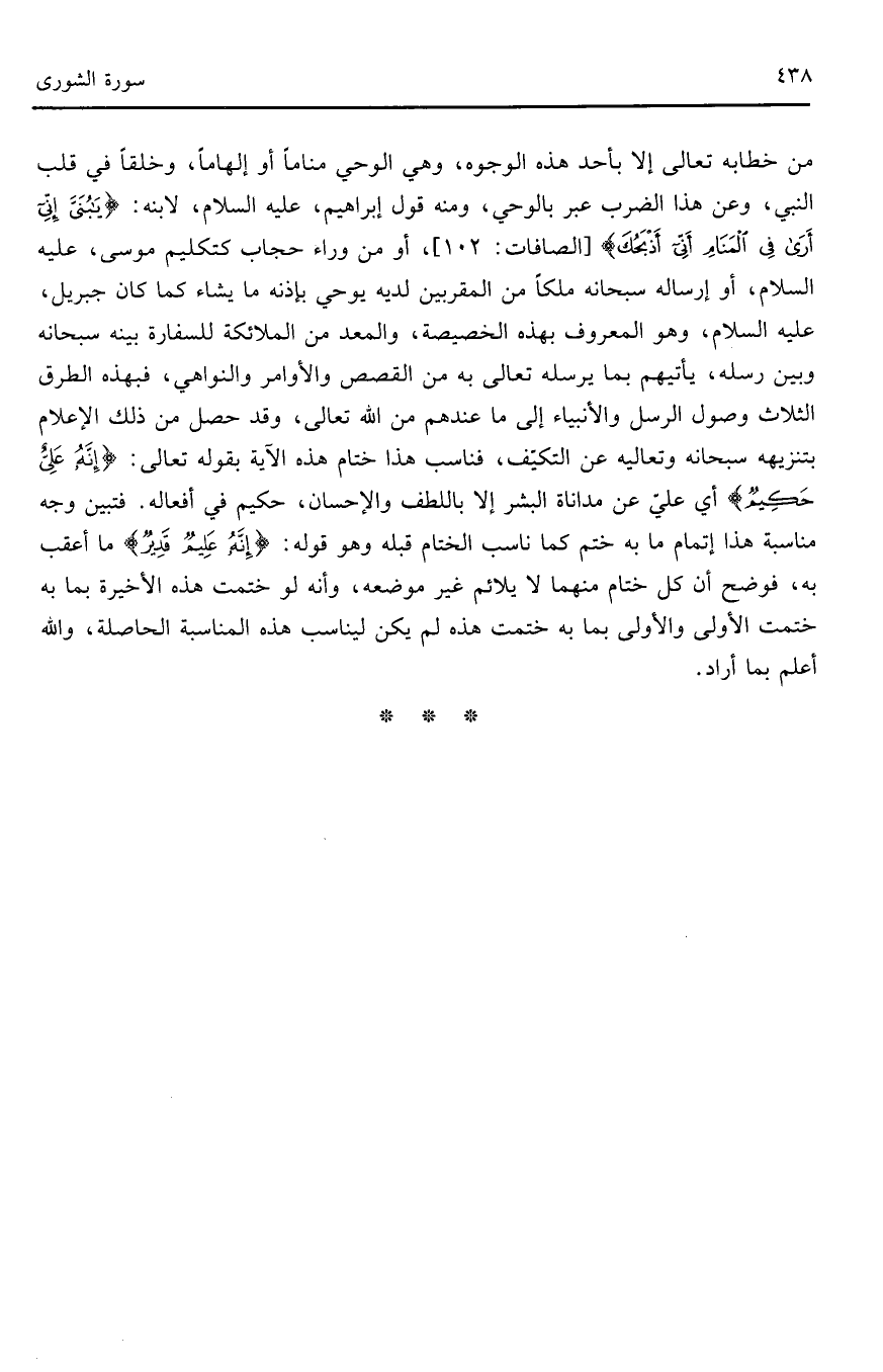 من خطابه تعالى إلا بأحد هذه الوجوه، وهي الوحي مناماً أو إلهاماً، وخلقاً في قلب النبي، وعن هذا الضرب عبر بالوحي، ومنه قول إبراهيم، عليه السلام، لابنه: (يَا بُنَيَّ إِنِّي أَرَى فِي الْمَنَامِ أَنِّي أَذْبَحُكَ) (الصافات: 102)، أو من وراء حجاب كتكليم موسى عليه السلام، أو إرساله سبحانه ملكاً من القربين لديه يوحي بإذنه ما يشاء كما كان جبريل، عليه السلام، وهو المعروف بهذه الخصيصة، والمعد من الملائكة للسفارة بينه سبحانه وبين رسله، يأتيهم بما يرسله تعالى به من القصص والأوامر والنواهي، فبهذه الطرق الثلاث وصول الرسل والأنبياء إلى ما عندهم من الله تعالى، وقد حصل من ذلك الإعلام بتنزيهه سبحانه وتعاليه عن التكيّيف، فناسب هذا ختام هذه الآية بقوله تعالى: (إِنَّهُ عَلِيٌّ حَكِيمٌ) أي عليّ عن مداناة البشر إلا باللطف والإحسان، حكيم في أفعالخ. فتبين وجه مناسبة هذا إتمام ما به ختم كما ناسب الختام قبله وهو قوله: (إِنَّهُ عَلِيمٌ قَدِيرٌ) ما أعقب به، فوضح أن كل ختام منهما لا يلائم غير موضعه، وأنه لو ختمت هذه الأخيرة بما به ختمت الأولى والأولى بما به ختمت هذه لم يكن ليناسب هذه المناسبة الحاصلة، والله أعلم بما أراد.