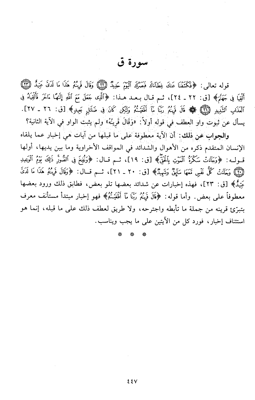 والجواب عن ذلك: أن الآية معطوفة على ما قبلها من آيات هي إخبار عما يلقاه الإنسان المتقدم ذكره من الأهوال والشدائد في المواقف الأخراوية وما بين يديها، أولها قوله: (وَجَاءَتْ سَكْرَةُ الْمَوْتِ بِالْحَقِّ) (ق: 19)، ثم قال: (وَنُفِخَ فِي الصُّورِ ذَلِكَ يَوْمُ الْوَعِيدِ * وَجَاءَتْ كُلُّ نَفْسٍ مَعَهَا سَائِقٌ وَشَهِيدٌ) (ق: 20 - 21)، ثم قال: (وَقَالَ قَرِينُهُ هَذَا مَا لَدَيَّ عَتِيدٌ) (ق: 23)، فهذه إخبارات عن شدائد بعضها تلو بعض، فطابق ذلك ورود بعضها معطوفاً على بعض. وأما قوله: (قَالَ قَرِينُهُ رَبَّنَا مَا أَطْغَيْتُهُ) فهو إخبار مبتدأ مستأنف معرف بتبرّئ قرينه من جملة ما تأبطه واجترحه، ولا طريق لعطف ذلك على ما قبله، إنما هو استئناف إخبار، فورد كل من الآيتين على ما يجب ويناسب.