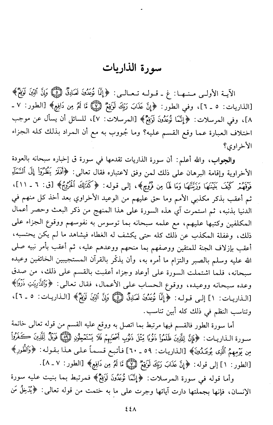الآية الأولى منها: غ - قوله تعالى: (إِنَّمَا تُوعَدُونَ لَصَادِقٌ * وَإِنَّ الدِّينَ لَوَاقِعٌ) (الذاريات: 5 - 6)، وفي الطور: (إِنَّ عَذَابَ رَبِّكَ لَوَاقِعٌ * مَا لَهُ مِنْ دَافِعٍ) (الطور: 7 - 8)، وفي المرسلات: (إِنَّمَا تُوعَدُونَ لَوَاقِعٌ) (المرسلات: 7)، للسائل أن يسأل عن موجب اختلاف العبارة عما وقع القسم عليه؟ وما جُووب به مع أن المراد بذلك كله الجزاء الأخراوي؟