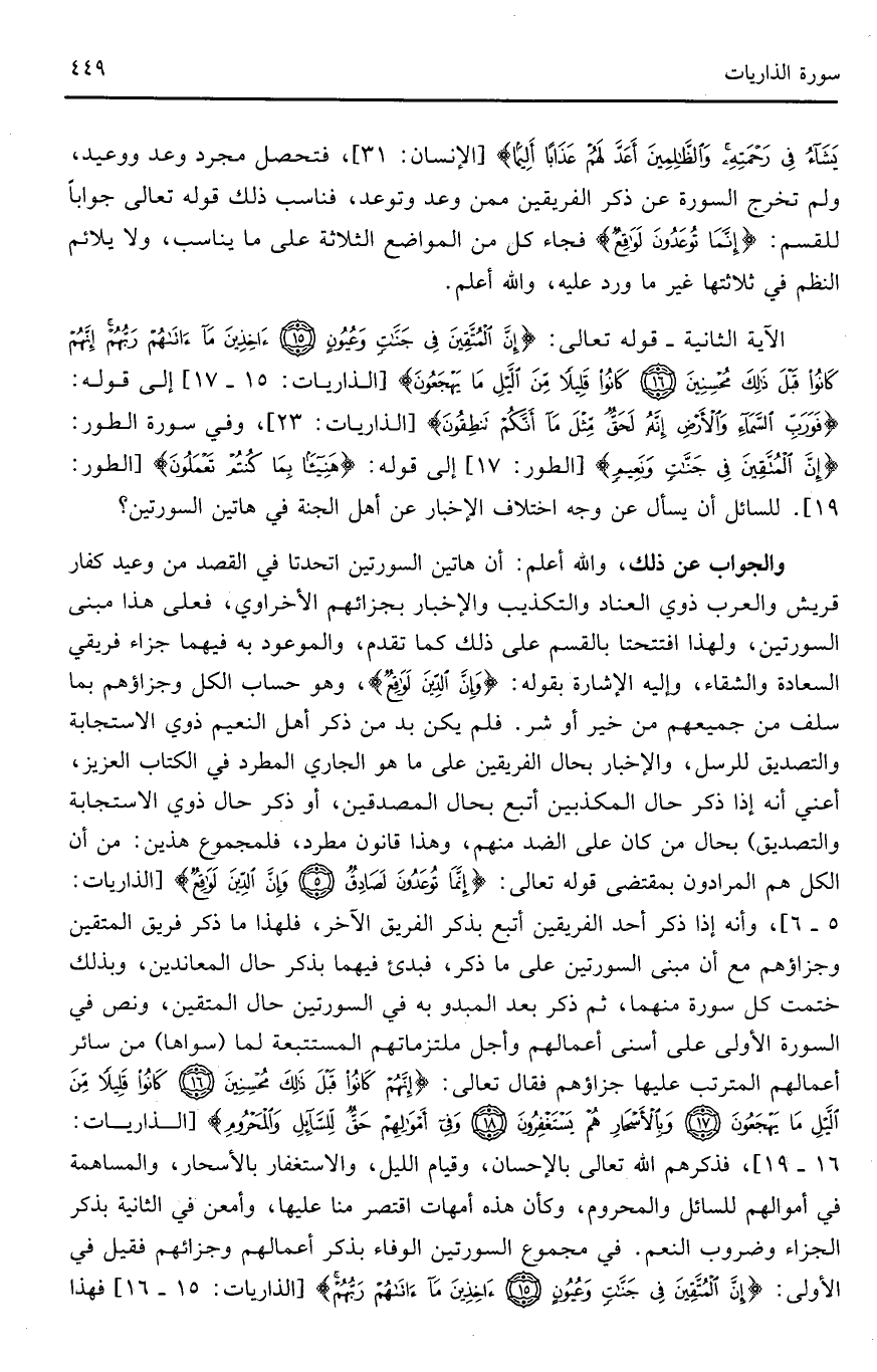 والجواب عن ذلك، والله أعلم: أن هاتين السورتين اتحدتا في القصد من وعيد كفار قريش والعرب ذوي العناد والتكذيب والإخبار بجزائهم الأخراوي، فعلى هذا مبنى السورتين، ولهذا افتتحتا بالقسم على ذلك كما تقدم، والموعود به فيهما جزاء فريقي السعادة والشقاء، وإليه الإشارة بقوله: (وَإِنَّ الدِّينَ لَوَاقِعٌ)، وهو حساب الكل وجزاؤهم بما سلف من جميعهم من خير أو شر. فلم يكن بد من ذكر أهل النعيم ذوي الاستجابة والتصديق للرسل، والإخبار بحال الفريقين على ما هو الجاري المطرد في الكتاب العزيز، أعني أنه إذا ذكر حال المكذبين أتبع بحال المصدقين، أو ذكر حال ذوي الاستجابة والتصديق) بحال من كان على الضد منهم، وهذا قانون مطرد، فلمجموع هذين: من أن الكل هم المرادون بمقتضى قوله تعالى: ((إِنَّمَا تُوعَدُونَ لَصَادِقٌ * وَإِنَّ الدِّينَ لَوَاقِعٌ) (الذاريات: 5 - 6)، وأنه إذا ذكر أحد الفريقين أتبع بذكر الفريق الآخر، فلهذا ما ذكر فريق المتقين وجزاؤهم مع أن مبتى السورتين على ما ذكر، فبدئ فيهما بذكر حال المعاندين، وبذلك ختمت كل سورة منهما، ثم ذكر بعد المبدو به في السورتين حال المتقين، ونص في السورة الأولى على أسنى أعمالهم وأجل ملتزماتهم المستتبعة لما (سواها) من سائر أعمالهم المترتب عليها جزاؤهم فقال تعالى: (آخِذِينَ مَا آتَاهُمْ رَبُّهُمْ إِنَّهُمْ كَانُوا قَبْلَ ذَلِكَ مُحْسِنِينَ * كَانُوا قَلِيلًا مِنَ اللَّيْلِ مَا يَهْجَعُونَ * وَبِالْأَسْحَارِ هُمْ يَسْتَغْفِرُونَ * وَفِي أَمْوَالِهِمْ حَقٌّ لِلسَّائِلِ وَالْمَحْرُومِ) (الذاريات: 16 - 19)، فذكرهم الله تعالى بالإحسان، وقيام الليل، والاستغفار بالأسحار، والمساهمة في أموالهم للسائل والمحروم، وكأن هذه أمهات اقتصر منا عليها، وأمعن في الثانية بذكر الجزاء وضروب النعم. في مجموع السورتين الوفاء بذكر أعمالهم وجزائهم فقيل في الأولى: (إِنَّ الْمُتَّقِينَ فِي جَنَّاتٍ وَعُيُونٍ * آخِذِينَ مَا آتَاهُمْ رَبُّهُمْ) (الذاريات: 15 - 16) فهذا