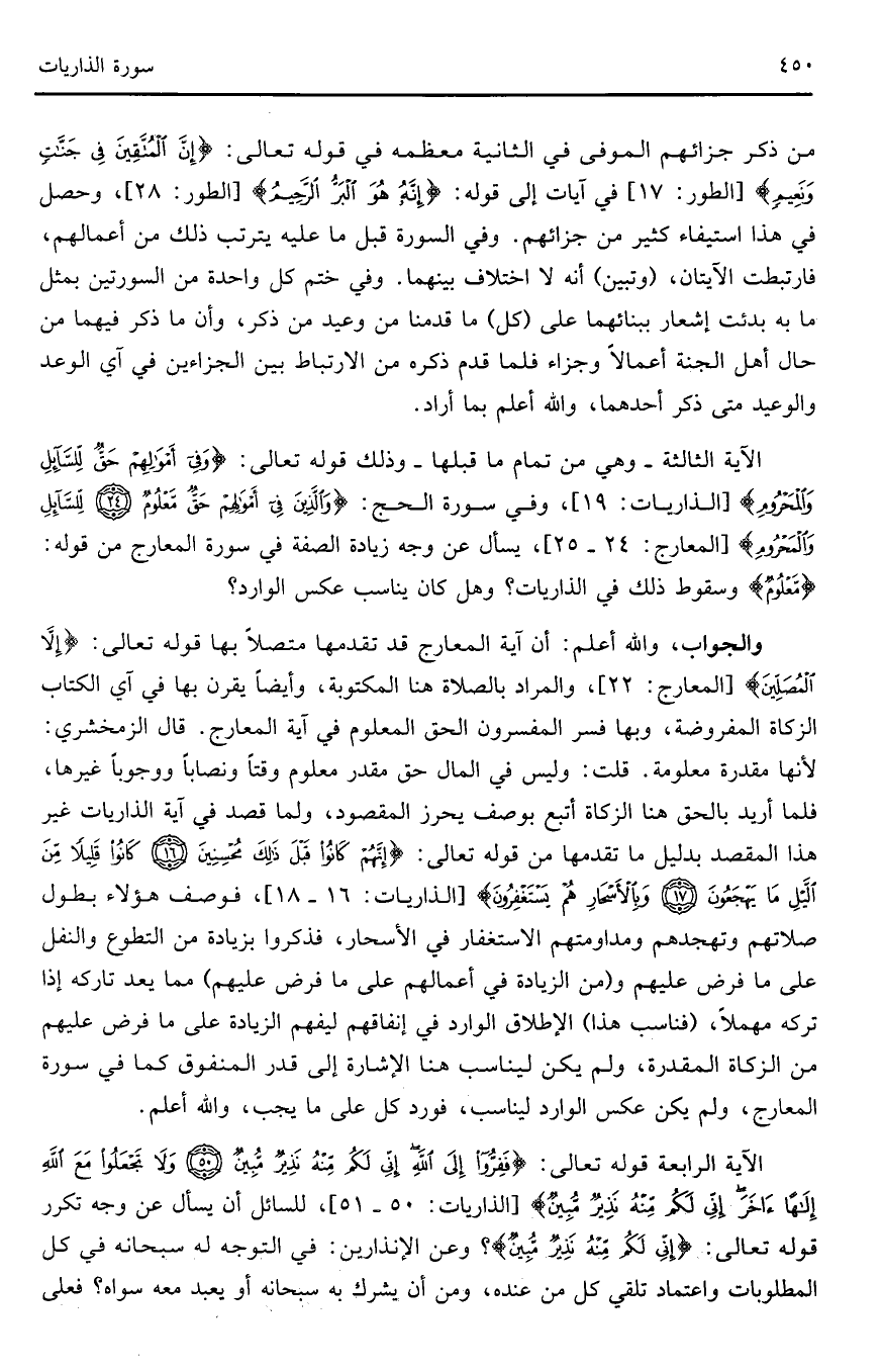 والجواب، والله أعلم: أن آية المعارج قد تقدمها متصلاً بها قوله تعالى: (إِلَّا الْمُصَلِّينَ) (المعارج: 22)، والمراد بالصلاة هنا المكتوبة، وأيضاً يقرن بها في آي الكتاب الزكاة المفروضة، وبها فسر المفسرون الحق المعلوم في آية المعارج. قال الزمخشري لنها مقدرة ملعومة. قلت: وليس في المال حق مقدر معلوم وقتاً ونصاباً ووجوباً غيرها، فلما أريد بالحق هنا الزكاة أتبع بوصف يححرز المقصود، ولما قصد في آية الذاريات غير هذا المقصد بدليل ما تقدمها من قوله تعالى: (آخِذِينَ مَا آتَاهُمْ رَبُّهُمْ إِنَّهُمْ كَانُوا قَبْلَ ذَلِكَ مُحْسِنِينَ * كَانُوا قَلِيلًا مِنَ اللَّيْلِ مَا يَهْجَعُونَ * وَبِالْأَسْحَارِ هُمْ يَسْتَغْفِرُونَ) (الذاريات: 16 - 18)، فوصف هؤلاء بطول صلاتهم وتهجدهم ومداومتهم الاستغفار في الأسحار، فذكروا بزيادة من التطوع والنفل على ما فرض عليهم و (من الزيادة في أعمالهم على ما فرض عليهم) مما يعد تاركه إذا تركه مهملاً، (فناسب هذا) الإطلاق الوارد في إنفاقهم ليفهم الزيادة على ما فرض عليهم من الزكاة المقدرة، ولم يكن ليناسب هنا الإشارة إلى قدر المنفوق كما في سورة المعارج، ولم يكن عكس الوارد ليناسب، فورد كل على ما يجب، والله أعلم.