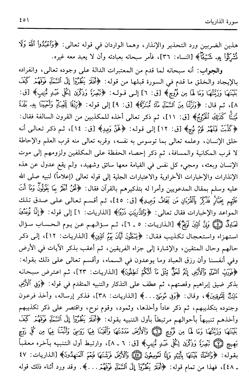 والجواب: أنه سبحانه لما قدم من المعتبرات الدالة على وجوده تعالى، وانفراده بالإيجاد والخلق ما قدم في السورة قبلها من قوله: (أَفَلَمْ يَنْظُرُوا إِلَى السَّمَاءِ فَوْقَهُمْ كَيْفَ بَنَيْنَاهَا وَزَيَّنَّاهَا وَمَا لَهَا مِنْ فُرُوجٍ) (ق: 6) إلى قوله: (تَبْصِرَةً وَذِكْرَى لِكُلِّ عَبْدٍ مُنِيبٍ) (ق: 8)، ثم قال: (وَنَزَّلْنَا مِنَ السَّمَاءِ مَاءً مُبَارَكًا) (ق: 9) إلى قوله: (رِزْقًا لِلْعِبَادِ وَأَحْيَيْنَا بِهِ بَلْدَةً مَيْتًا كَذَلِكَ الْخُرُوجُ) (ق: 11)، ثم ذكر تعالى أخذه للمذكبين من القرون السالفة فقال: (كَذَّبَتْ قَبْلَهُمْ قَوْمُ نُوحٍ) (ق: 12) إلى قوله: (فَحَقَّ وَعِيدِ) (ق: 14)، ثم ذكر تعالى أنه خلق الإنسان، وعلمه تعالى بما توسوس به نفسه، وقربه تعالى منه قرب العلم والإحاطة لا قرب المكانية والمسافة، ثم ذكر إحصاء الحفظة على المكلفين ولزومهم إلى موت الإنسان وبعثه، ومجيء كل نفس في القايمة معها سائق وشهيد، ولم يقع عدول عن هذه الإنذارات والإخبارات الأخراوية والاعتبارات الجلية إلى قوله تعالى (إعلاماً) لنبيه صلى الله عليه وسلم بمقال المدعويين وأمرا له بتذكيرهم بالقرآن فقال: (نَحْنُ أَعْلَمُ بِمَا يَقُولُونَ وَمَا أَنْتَ عَلَيْهِمْ بِجَبَّارٍ فَذَكِّرْ بِالْقُرْآنِ مَنْ يَخَافُ وَعِيدِ) (ق: 45)، ثم أقسم تعالى على صدق تلك المواعد والإخبارات فقال تعالى: (وَالذَّارِيَاتِ ذَرْوًا) (الذاريات: 1) إلى قوله: (إِنَّمَا تُوعَدُونَ لَصَادِقٌ * وَإِنَّ الدِّينَ لَوَاقِعٌ) (الذاريات: 5 - 6)، ثم سؤالهم عن يوم الحساب سؤال استهزاء واستعجال تكذيب فقال: (يَسْأَلُونَ أَيَّانَ يَوْمُ الدِّينِ) (الذارات: 12)، إلى ذكر حالهم وحال المتقين، والإشارة إلى جزاء الفريقين، ثم أعقب بذكر الآيات في الأرض وفي أنفسنا وأن رزق العباد وما يوعدون في السماء، وأقسم تعالى على ذلك بقوله: (فَوَرَبِّ السَّمَاءِ وَالْأَرْضِ إِنَّهُ لَحَقٌّ مِثْلَ مَا أَنَّكُمْ تَنْطِقُونَ) (الذاريات: 23)، ثم اعترض سبحانه بذكر ضيق إبراهيم وقصتهم، ثم عطف على التذكار والتنبيه المتقدم في قوله: (وَفِي الْأَرْضِ آيَاتٌ لِلْمُوقِنِينَ)، وقال: (وَفِي مُوسَى ... ) (الذاريات: 38)، فذكر إرساله، وأخذ فرعون وجنوده بتكذيبهم، ثم ذكر عاداً وأخذها، وثمود، وقوم نوح، واقتصر على ذكر تكذيبهم وأخذهم نبيهاً بأوالهم مرتبطاً بأول التنبيه بقوله: (أَفَلَمْ يَنْظُرُوا إِلَى السَّمَاءِ فَوْقَهُمْ كَيْفَ بَنَيْنَاهَا وَزَيَّنَّاهَا وَمَا لَهَا مِنْ فُرُوجٍ * وَالْأَرْضَ مَدَدْنَاهَا وَأَلْقَيْنَا فِيهَا رَوَاسِيَ وَأَنْبَتْنَا فِيهَا مِنْ كُلِّ زَوْجٍ بَهِيجٍ * تَبْصِرَةً وَذِكْرَى لِكُلِّ عَبْدٍ مُنِيبٍ) (ق: 6 - 8)، وارتبط أول التنبيه بآخره معقباً بقوله: (وَالسَّمَاءَ بَنَيْنَاهَا بِأَيْدٍ وَإِنَّا لَمُوسِعُونَ (47) وَالْأَرْضَ فَرَشْنَاهَا فَنِعْمَ الْمَاهِدُونَ) (الذاريات: 47 - 48)، فهذا من تمام قوله: (أَفَلَمْ يَنْظُرُوا إِلَى السَّمَاءِ فَوْقَهُمْ ... ) (ق: 6). وقد ورد أثناء ذلك قوله