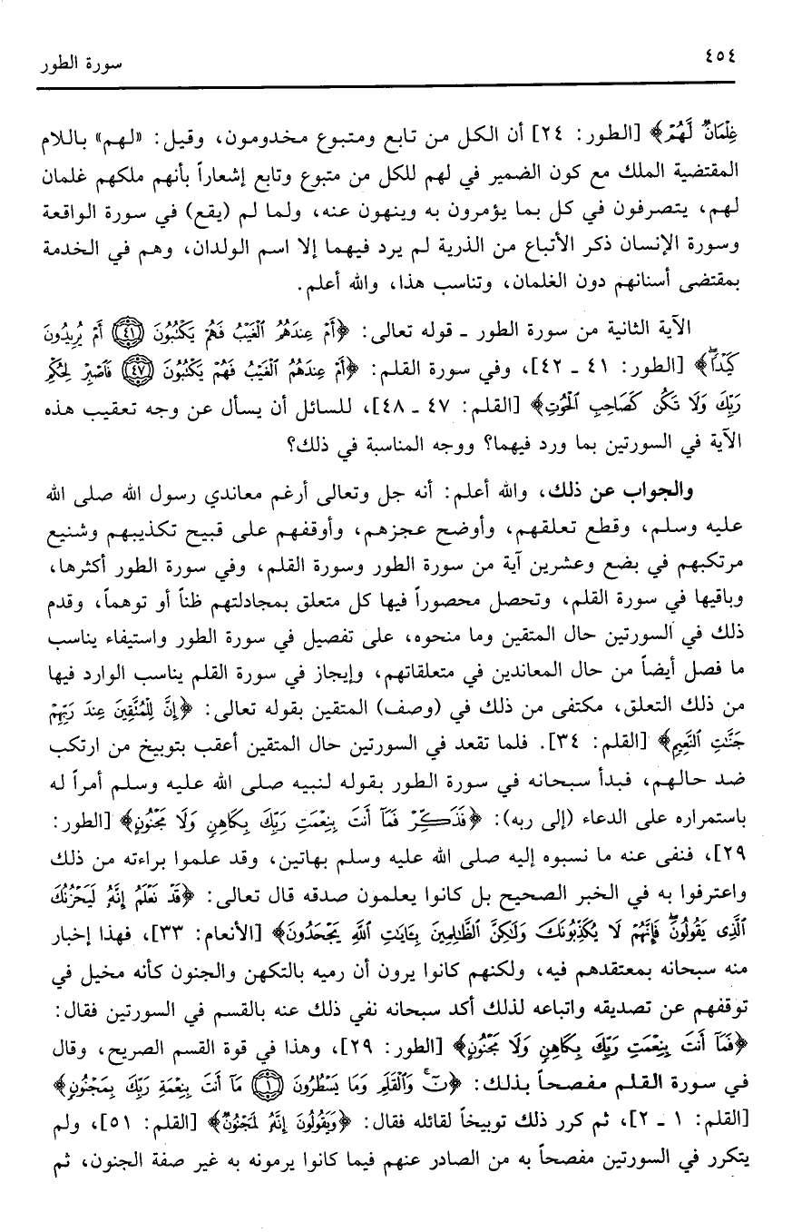 والجواب عن ذلك، والله أعلم: أنه جل وتعالى أرغم معاندي رسول الله صلى الله عليه وسلم، وقطع تعلقهم، وأوضح عجزهم، وأوقفهم على قبيح تكذيبهم وشنيع مرتكبهم في بضع وعشرين آية من سورة الطور وسورة القلم، وفي سورة الطور أكثرها، وباقيها في سورة القلم، وتصل محصوراً فيها كل متعلق بمجادلتهم ظناً أو توهماً، وقدم ذلك في السورتين حال المتقين وما منحوه، على تفصيل في سورة الطور واستيفاء يناسب ما فصل أيضاً من حال المعاندين في متعلقاتهم، وإيجاز في سورة القلم يناسب الوارد فيها من ذلك التعلق، مكتفي من ذلك في (وصف) المتقين بقوله تعالى: (إِنَّ لِلْمُتَّقِينَ عِنْدَ رَبِّهِمْ جَنَّاتِ النَّعِيمِ) (القلم: 34). فلما تقعد في السورتين حال المتقين أعقب بتوبيخ من ارتكب ضد حالهم، فبدأ سبحانه في سورة الطور بقوله لنبيه صلى الله عليه وسلم أمراً له باستمراره على الدعاء (إلى ربه): (فَذَكِّرْ فَمَا أَنْتَ بِنِعْمَتِ رَبِّكَ بِكَاهِنٍ وَلَا مَجْنُونٍ) (الطور: 29)، فنفي عنه ما نسبوه إليه صلى الله عليه وسلم بهاتين، وقد علموا براءته من ذلك واعترفوا به في الخبر الصحيح بل كانوا يعلمون صدقة قال تعالى: (قَدْ نَعْلَمُ إِنَّهُ لَيَحْزُنُكَ الَّذِي يَقُولُونَ فَإِنَّهُمْ لَا يُكَذِّبُونَكَ وَلَكِنَّ الظَّالِمِينَ بِآيَاتِ اللَّهِ يَجْحَدُونَ) (الأنعام: 33)، فهذا إخبار منه سبحانه بمعتقدهم فيه، ولكنهم كانوا يرون أن رميه بالتكهن والجنون كأنه مخيل في توقفهم عن تصديقة واتباعه لذلك أكد سبحانه نفي ذلك عنه بالقسم في السورتين فقال (فَذَكِّرْ فَمَا أَنْتَ بِنِعْمَتِ رَبِّكَ بِكَاهِنٍ وَلَا مَجْنُونٍ) (الطور: 29)، وهذا في قوة القسم الصريح، وقال في سورة القلم مفصحاً بذلك: (ن وَالْقَلَمِ وَمَا يَسْطُرُونَ * مَا أَنْتَ بِنِعْمَةِ رَبِّكَ بِمَجْنُونٍ) (القلم: 1 - 2)، ثم كرر ذلك توبيخاً لقائله فقال: (وَيَقُولُونَ إِنَّهُ لَمَجْنُونٌ) (القلم: 51)، ولم يتكرر في السورتين مفصحاً به من الصادر عنهم فيما كانوا يرمونه به غير صفة الجنون، ثم