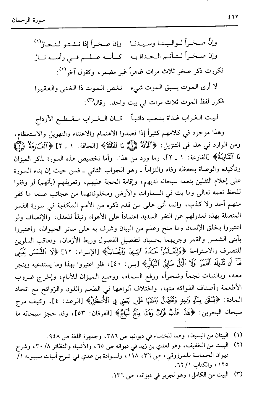 وهذا موجود في كلامهم كثيراً إذا قصدوا الاهتمام والاعتناء والتهويل والاستعظام، ومن الوارد في هذا في التنزيل: (الْحَاقَّةُ * مَا الْحَاقَّةُ) (الحاقة: 1 - 2) (الْقَارِعَةُ * مَا الْقَارِعَةُ) (القارعة: 1 - 2)، وما ورد من هذا. وأما تخصيص هذه السورة بذكر الميزان وأكيده والوصاة بحفظه وفاء والتزاماً - وهو الجواب الثاني - فمن حيث إن بناء السورة على إعلام الثقلين بنعمة سبحانه لديهم، وإقامة الحجة عليهم، وتعريفهم (بأنهم) لو وفقوا للحظ نعمة تعالى وما بث في السماوات والأرض وخلوقاتهما من عجائب صنعه ما كفر منهم أحد ولا كذب، وإنما أتى على من قدم ذكره من الأمم المكذبة في سورة القمر المتصلة بهذه لعدولهم عن النظر السديد اعتماداً على الأهواء ونبذاً للعدل، والإنصاف ولو اعتبروا بخلق الإنسان وما منح وعلم من البيان وشرف به على سائر الحيوان، واعتبروا بآيتي الشمس والقمر وجريهما بحسبان لتفصيل الفصول وربط الأزمان، وتعاقب الملوين للتصرف والاستراحة (وَلِتَعْلَمُوا عَدَدَ السِّنِينَ وَالْحِسَابَ) (الإسراء: 12) (لَا الشَّمْسُ يَنْبَغِي لَهَا أَنْ تُدْرِكَ الْقَمَرَ وَلَا اللَّيْلُ سَابِقُ النَّهَارِ) (يس: 40)، فلو اعتبروا بهذا وما يستدعيه وينجر معه، وبالنبات نجماً وشجراً، ورفع السماء، ووضع الميزان للأنام، إخراج ضورب الأطعمة وأصناف الفواكه منها، واختلاف أنواعها في الطعن واللون والروائح مع اتحاد المادة: (يُسْقَى بِمَاءٍ وَاحِدٍ وَنُفَضِّلُ بَعْضَهَا عَلَى بَعْضٍ فِي الْأُكُلِ) (الرعد: 4)، وكيف مرج سبحانه البحرين: (هَذَا عَذْبٌ فُرَاتٌ وَهَذَا مِلْحٌ أُجَاجٌ) (الفرقان: 53)، وقد حجز سبحانه ما