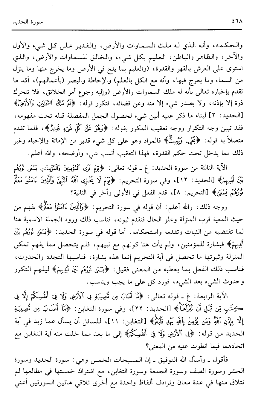 ووجه ذلك، والله أعلم: أن قوله في سورة التحريم (الَّذِينَ آمَنُوا مَعَهُ) يفهم من حيث المعية قرب المنزلة وعلو الحال فتقدم ثبوته، فناسب ذلك ورود الجملة الاسمية هنا لما تقتضيه من الثبات وتقدمه واستحكامه. أما قوله في سورة الحديد: (يَسْعَى نُورُهُمْ بَيْنَ أَيْدِيهِمْ) فبشارة للمؤمنين، ولم يأت هنا كونهم مع نبيهم، فلم يتحصل مما يفهم تمكن المنزلة وثبوتها ما تحصل في آية التحريم إنما هذه بشارة، فناسبها التجدد والحدوث، فناسب ذلك الفعل بما يعطيه من المعنى فقيل " يسعى نورهم بين أيديهم " ليفهم التكرر وحدوث الشئ بعد الشئ، فورد كل على ما يجب ويناسب.