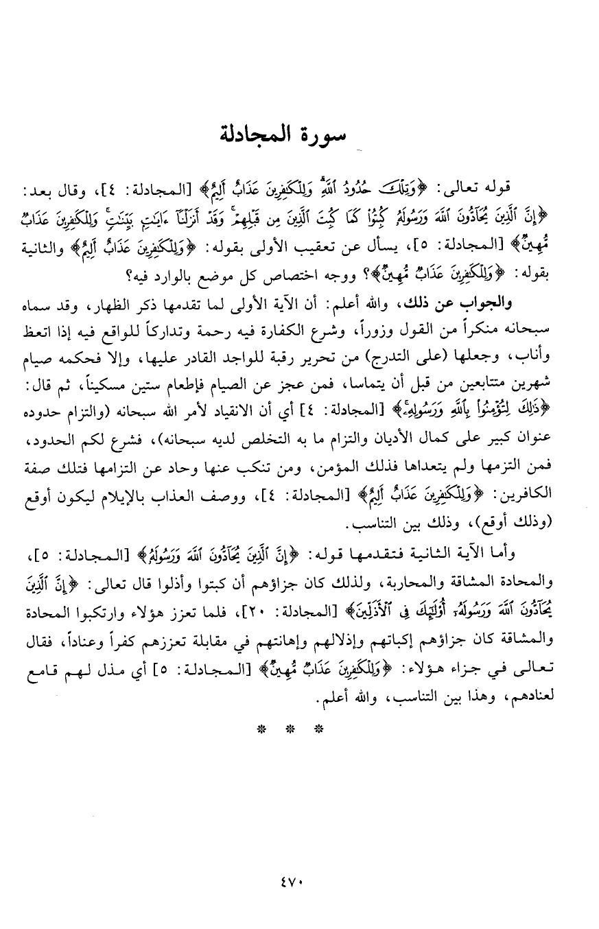 وأما الآية الثانية فتقدمها قوله: (إِنَّ الَّذِينَ يُحَادُّونَ اللَّهَ وَرَسُولَهُ) (المجادلة: 5)، والمحادة المشاقة والمحاربة، ولذلك كان جزاؤهم أن كبتوا وأذلوا قال تعالى: (إِنَّ الَّذِينَ يُحَادُّونَ اللَّهَ وَرَسُولَهُ أُولَئِكَ فِي الْأَذَلِّينَ) (المجادلة: 20)، فلما تعزز هؤلاء وارتكبوا المحادة والمشاقة كان جزاؤهم إكباتهم وإذلالهم وأهانتهم في مقابلة تعززهم كفراً وعناداً، فقال تعالى في جزاء هؤلاء: (وَلِلْكَافِرِينَ عَذَابٌ مُهِينٌ) (المجادلة: 5) أي مذل لهم قامع لعنادهم، وهذا بين التناسب، والله أعلم.