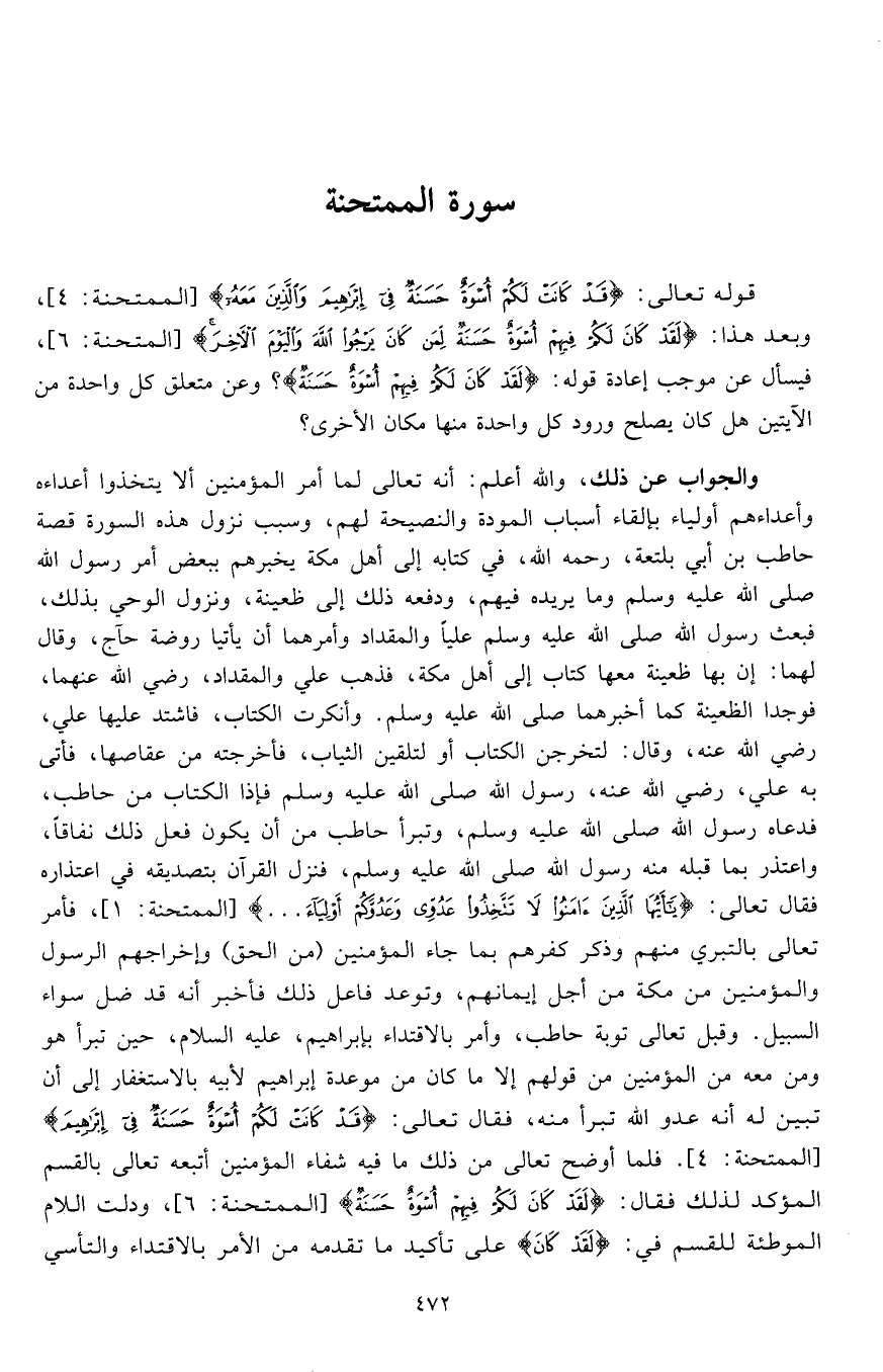 والجواب عن ذلك، والله أعلم: أنه تعالى لما أمر المؤمنين ألا يتخذوا أعداءه وأعداءهم أولياء بإلقاء أسباب المودة والنصيحة لهم، وسبب نزول هذه السورة قصة حاطب بن أبي بلتعة، رحمه الله، فى كتابة إلى أهل مكة يخبرهم ببعض أمر رسول الله صلي الله عليه وسلم وما يريده فيهم، ودفعة ذلك إلى ظعينة، ونزول الوحي بذلك، فبعث رسول الله صلي الله عليه وسلم علياً والمقداد وأمرهما أن يأتيا روضة حاج، وقال لهما: إن بها ظعينة معها كتاب إلى أهل مكة، فذهب علي والمقداد وأمرهما أن يأتيا روضة حاج، وقال لهما: إن بها ظعينة معها كتاب إلى أهل مكة، فذهب علي والمقداد، رضي الله عنهما، فوجدا الظعينة كما أخبرهما صلي الله عليه وسلم. وأنكرت الكتاب، فاشتد عليها علي، رضي الله عنه، وقال: لتخرجن الكتاب او لتلقين الثياب، فأخرجته من عقاصها، فأتي به علي، رضي الله عنه، رسول الله صلي الله عليه وسلم فإذا الكتاب من حاطب، فدعاه رسول الله صلي الله عليه وسلم، وتبرأ حاطب من أن يكون فعل ذلك نفاقاً، واعتذر بما قبله منه رسول الله صلي الله عليه وسلم، فنزل القرآن بتصديقه في اعتذاره فقال تعالى: (يَا أَيُّهَا الَّذِينَ آمَنُوا لَا تَتَّخِذُوا عَدُوِّي وَعَدُوَّكُمْ أَوْلِيَاءَ) (الممتحنة: 1)، فأمر تعالى بالتبري منهم وذكر كفرهم بما جاء المؤمنين (من الحق) وإخراجهم الرسول والمؤمنين من مكة من أجل إيمانهم، وتوعد فاعل ذلك فأخبر أنه قد ضل سواء السبيل، وقبل تعالى توبة حاطب، وأمر بالاقتداء إبراهيم، عليه السلام، يحن تبرأ هو ومن معه من المؤمنين من قولهم إلا ما كان من موعدة إبراهيم لأبيه بالاستغفار إلى أن تبين له أنه عدو الله تبرأ منه، فقال تعالى: (قَدْ كَانَتْ لَكُمْ أُسْوَةٌ حَسَنَةٌ فِي إِبْرَاهِيمَ) (الممتحنة: 4). فلما أوضح تعالى من ذلك ما فيه شفاء المؤمنين اتبعه تعالى بالقسم المؤكد لذلك فقال: (قَدْ كَانَ لَكُمْ فِيهِمْ أُسْوَةٌ حَسَنَةٌ) (الممتحنة: 6)، ودلت اللام الموطئة للقسم في " لقد كان " على تأكيد ما تقدمه من الأمر بالاقتداء والتأسي