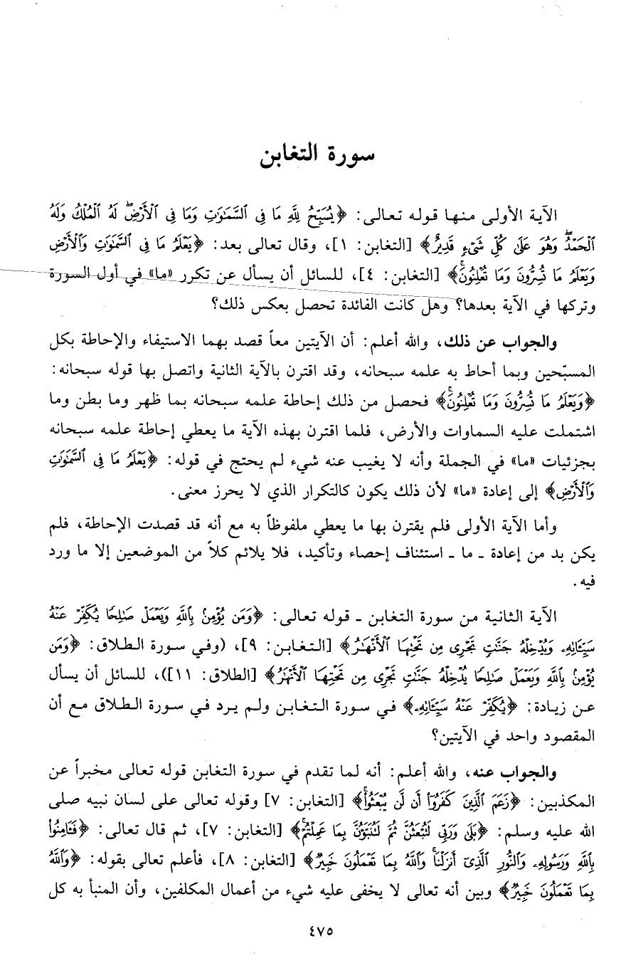الآية الأولى منها قوله تعالى: (يُسَبِّحُ لِلَّهِ مَا فِي السَّمَاوَاتِ وَمَا فِي الْأَرْضِ لَهُ الْمُلْكُ وَلَهُ الْحَمْدُ وَهُوَ عَلَى كُلِّ شَيْءٍ قَدِيرٌ) (التغابن: 1)، وقال تعالى بعد: (يَعْلَمُ مَا فِي السَّمَاوَاتِ وَالْأَرْضِ وَيَعْلَمُ مَا تُسِرُّونَ وَمَا تُعْلِنُونَ) (التغابن: 4) للسائل أن يسأل عن تكرر " ما " في أول السورة وتركها في الآية بعدها؟ وهل كانت الفائدة تحصل بعكس ذلك؟