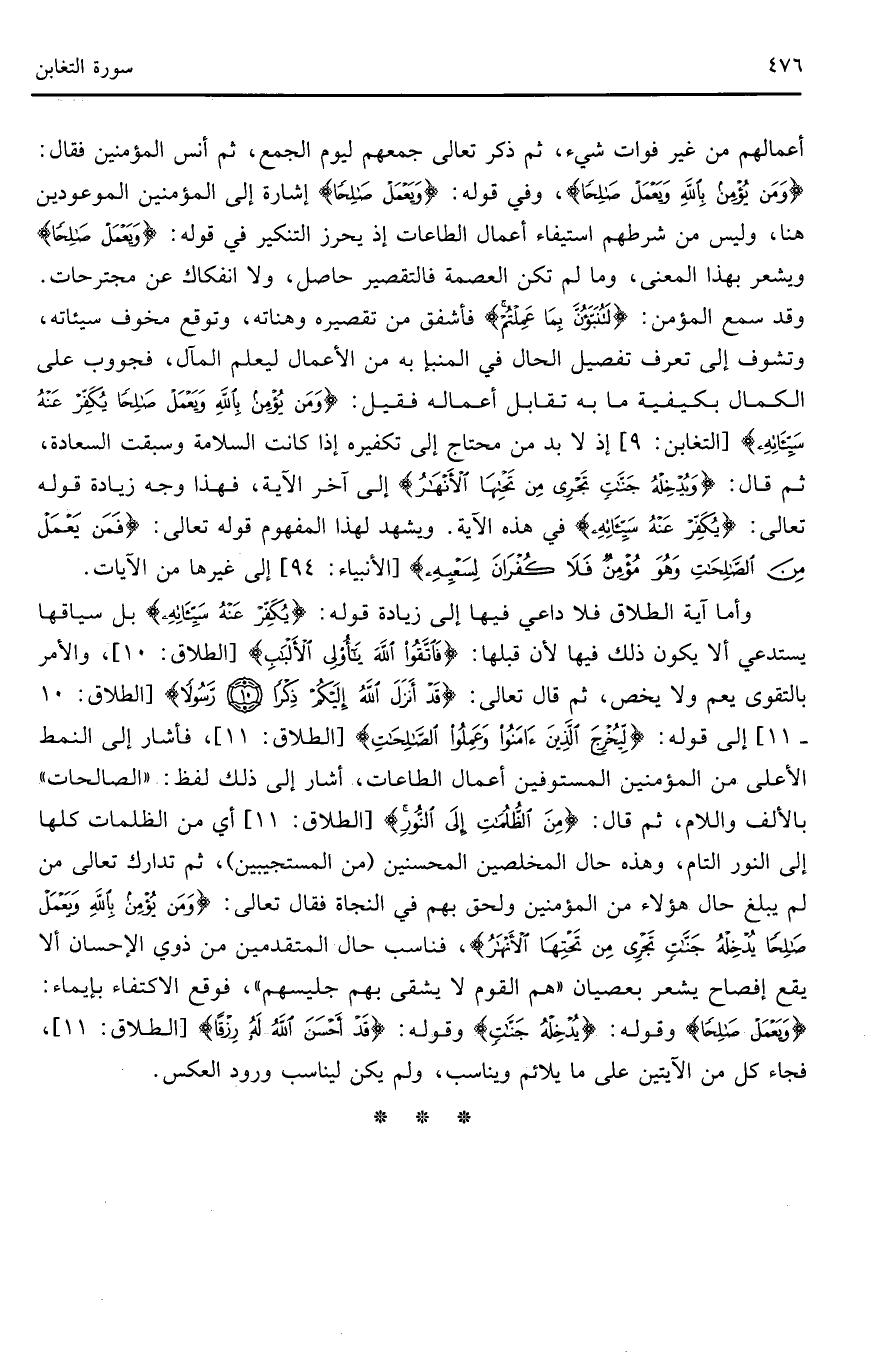 أعمالهم من غير فوات شئ، ثم ذكر تعالى جمعهم ليوم الجمع، ثم أنس المؤمنين فقال: " ومن يؤمن بالله ويعمل صالحاً "، وفي قوله تعالى: " ويعمل صالحاً " إشارة إلى المؤمنين الموعودين هنا، وليس من شرطهم استيفاء أعمال الطاعات إذ يحرز التنكير في قوله: " ويعمل صالحا" ويشعر بهذا المعنى، وما لم تكن العصمة فالتقصير حاصل، ولا انفكاك عن مجترجات، وقد سمع المؤمن " " لتنبؤون بما عملتم " فأشفق من تقصيره وهناته، وتوقع مخوف سيئاته، وتشوف إلى تعرف تفصيل الحال في المنبأ به من الأعمال ليعلم المآل، فوجوب على الكمال بكيفية ما به تقابل أعماله فقيل: (وَمَنْ يُؤْمِنْ بِاللَّهِ وَيَعْمَلْ صَالِحًا يُكَفِّرْ عَنْهُ سَيِّئَاتِهِ) (التغابن: 9) إذ لابد من محتاج إلى تكفيره إذا كانت السلامة وسبقت السعادة ثم قال: "ويدخله جنات تجري من تحتها الأنهار" إلى آخر الآية، فهذا وجه زيادة قوله تعالى: "يكفر عنه سيئاته" في هذه الآية. ويشهد لهذا المفهوم قوله تعالى: (فَمَنْ يَعْمَلْ مِنَ الصَّالِحَاتِ وَهُوَ مُؤْمِنٌ فَلَا كُفْرَانَ لِسَعْيِهِ) (الأنبياء: 94) إلى غيرها من الآيات.