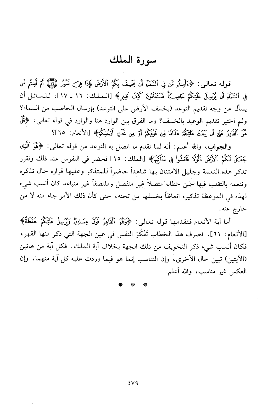 أما آية الأنعام فتقدمها قوله تعالى: (وَهُوَ الْقَاهِرُ فَوْقَ عِبَادِهِ وَيُرْسِلُ عَلَيْكُمْ حَفَظَةً) (الأنعام: 61)، فصرف هذا الخطاب تفكر النفس في عين الجهة التى ذكر منها القهر، فكان أنسب شئ ذكر التخويف من تلك الجهة بخلاف آية الملك. فكل آية من هاتين (الآيتين) تبين حال الأخرى، وإن التناسب إنما هو فيما وردت عليه كل آية منهما، وإن العكس غير مناسب، والله أعلم.
