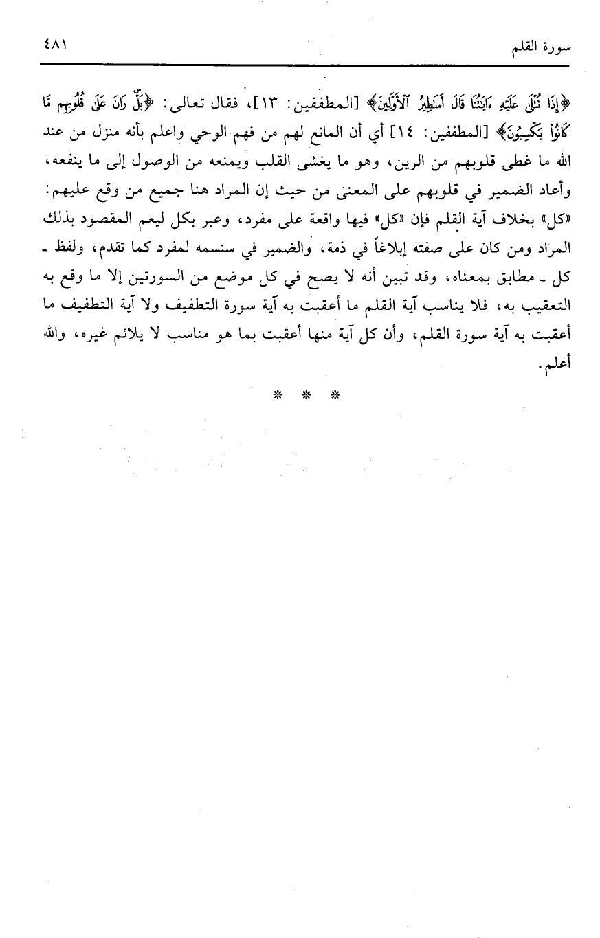 (إِذَا تُتْلَى عَلَيْهِ آيَاتُنَا قَالَ أَسَاطِيرُ الْأَوَّلِينَ) (المطففين: 13) فقال تعالى: (كَلَّا بَلْ رَانَ عَلَى قُلُوبِهِمْ مَا كَانُوا يَكْسِبُونَ) (المطففين: 14) أي أن المانع لهم من فهم الوحي وأعلم بأنه منزل من عند الله ما غطى قلوبهم من الرين، وهو ما يغشى القلب ويمنعه من الوصول إلى ما ينفعه، وأعاد الضمير في قلوبهم على المعنى من حيث أن المراد هنا جميع من وقع عليهم: " كل " بخلاف أية القلم فإن " كل " فيها واقعة على مفرد، وعبر بكل ليعم المقصود بذلك المراد ومن كان على صفته إبلاغاً في ذمة، والضمير فى سنسمه لمفرد كما تقدم، ولفظ - كل - مطابق بمعناه، وقد تبين أنه لا يصح في كل موضع من السورتين إلا ما وقع به التعقيب به، فلا يناسب آية القلم ما أعقبت به آية سورة التطفيف ولا آية التطفيف ما أعقبت به آية سورة القلم، وأن كل آية منها أعقبت بما هو مناسب لا يلائم غيره، والله أعلم.
