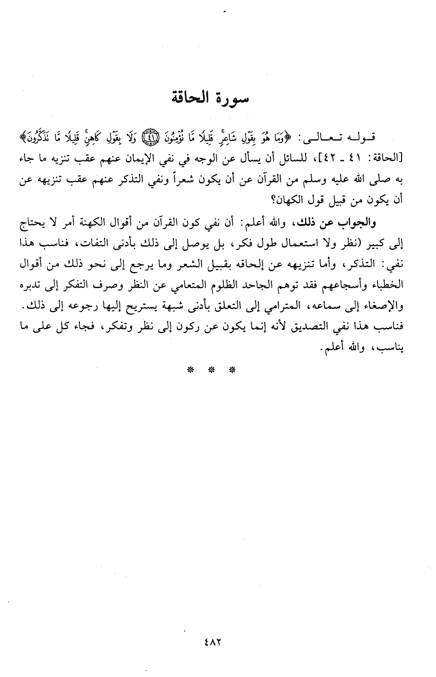 قوله تعالى: (وَمَا هُوَ بِقَوْلِ شَاعِرٍ قَلِيلًا مَا تُؤْمِنُونَ (41) وَلَا بِقَوْلِ كَاهِنٍ قَلِيلًا مَا تَذَكَّرُونَ) (الحاقة: 41 - 42)، للسائل أن يسأل عن الوجه في نفي الإيمان عنهم عقب تنزيه ما جاء به صلي الله عليه وسلم من القرآن عن أن يكون شعراً ونفي التذكر عنهم عقب تنزيهه عن أن يكون من قبيل قول الكهان؟