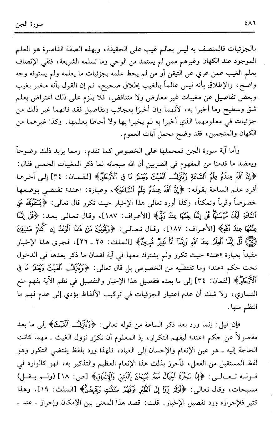 وأما آية سورة الجن فمحملها على الخصوص كما تقدم، ومما يزيد ذلك وضوحاً ويعضد ما قدمنا من المفهوم في الضربين أن الله سبحانه لما ذكر المغيبات الخمس فقال: (إِنَّ اللَّهَ عِنْدَهُ عِلْمُ السَّاعَةِ وَيُنَزِّلُ الْغَيْثَ وَيَعْلَمُ مَا فِي الْأَرْحَامِ) (لقمان: 34) إلى آخرها أفرد علم الساعة بقوله: (إن الله عنده علم الساعة)، وعبارة: " عند" تقتضى بوضعها خصوصاً وقرباً وتمكنا، وكذا أورد تعالى هذا الإخبار حيث تكرر قال تعالى بعد: (يَسْأَلُونَكَ عَنِ السَّاعَةِ أَيَّانَ مُرْسَاهَا قُلْ إِنَّمَا عِلْمُهَا عِنْدَ رَبِّي) (الأعراف 187)، وقال تعال: (وَيَقُولُونَ مَتَى هَذَا الْوَعْدُ إِنْ كُنْتُمْ صَادِقِينَ (25) قُلْ إِنَّمَا الْعِلْمُ عِنْدَ اللَّهِ وَإِنَّمَا أَنَا نَذِيرٌ مُبِينٌ) (الملك: 25 - 26)، فجرى هذا الإخبار مقيداً بعبارة "عند" حيث تكرر ولم يشترك معها في آية لقمان ما ذكر بعدها في الدخول تحت حكم " عند" وما تقتضيه من الخصوص بل قال تعالى: (وَيُنَزِّلُ الْغَيْثَ وَيَعْلَمُ مَا فِي الْأَرْحَامِ) (لقمان: 34) إلى ما بعده فتفصيل هذا الإخبار والتفصيل في نظم الآية يفهم منع التساوي، ولا شك أن عدم اعتبار الجزئيات في تركيب الألفاظ يؤدي إلى عدم فهم ما انتظم منها.