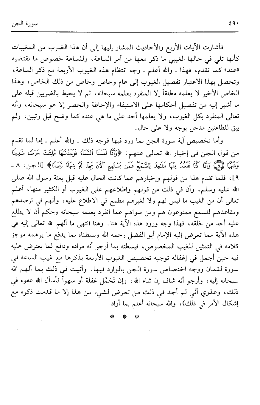 وأما تخصيص آية سورة الجن بما ورد فيها فوجه ذلك - والله أعلم - إما لم تقدم من قول الجن في إخبار الله تعالى عنهم: (وَأَنَّا لَمَسْنَا السَّمَاءَ فَوَجَدْنَاهَا مُلِئَتْ حَرَسًا شَدِيدًا وَشُهُبًا (8) وَأَنَّا كُنَّا نَقْعُدُ مِنْهَا مَقَاعِدَ لِلسَّمْعِ فَمَنْ يَسْتَمِعِ الْآنَ يَجِدْ لَهُ شِهَابًا رَصَدًا) (الجن: 8 - 9)، فلما تقدم هذا من قولهم وإخبارهم عما كانت الحال عليه قبل بعثة رسول الله صلي الله عليه وسلم، وأن في ذلك من قولهم واطلاعهم على الغيوب أو الكثير منها، أعلم تعالى أن من الغيب ما ليس لهم ولا لغيرهم مطمع في الإطلاع عليه، وأنهم في ترصدهم ومقاعدهم للسمع ممنوعون هم ومن سواهم عما انفرد بعلمه سبحانه وحكم أن لا يطلع عليه أحد من خلقه، فهذا وجه ورود هذه الآية هنا. وهنا انتهى ما ألهم الله تعالى إليه في هذه الآية مما تعرض إليه الإمام أبو الفضل رحمه الله وبسطناه بما يدفع ما يوهمه موجز كلامه في التمثيل للغيب المخصوص، فبسطته بما أرجو أنه مراده ودافع لما يعترض عليه فيه حين أجمل في إغفاله توجيه تخصيص الغيوب الأربعة بذكرها مع غيب الساعة في سورة لقمان ووجه اختصاص سورة الجن بالوارد فيها، وأتيت في ذلك بما ألهم الله سبحانه إليه، وأرجو أنه شاف إن شاء الله، وإن تحمل غفلة أو سهواً فأسأل الله عفوه في ذلك، وعذري أنى لم أجد في ذلك من تعرض لشئ من هذا إلا ما قدمت ذكره مع إشكال الأمر في ذلك)، والله سبحانه أعلم بما أراد.