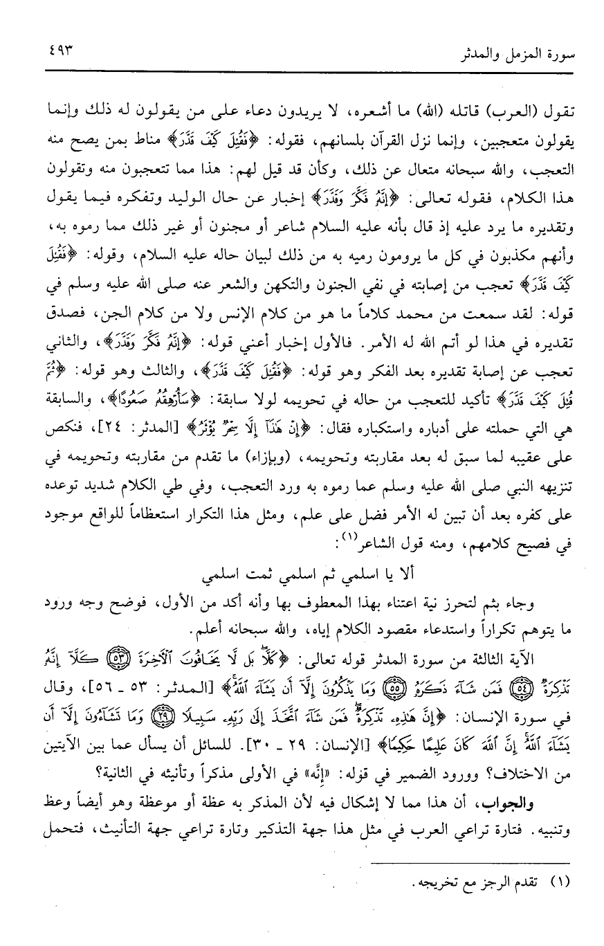 تقول (العرب) قاتله (الله) ما أشعره، لا يريدون دعاء على من يقولون له ذلك وإنما يقولون متعجبين، وإنما نزل القرآن بلسانهم، فقوله (فقتل كيف قدر) مناط بمن يصح منه التعجب، والله سبحانه متعال عن ذلك، وكأن قد قيل لهم: هذا مما تتعجبون منه وتقولون هذا الكلام، فقوله تعالى: (إنه فكر وقدر) إخبار عن حال الوليد وتفكره فيما يقول وتقديره ما يرد عليه إذ قال بأنه عليه السلام شاعر أو مجنون أو غير ذلك مما رموه به، وأنهم مكذبون في كل ما يرومون رميه به من ذلك لبيان حاله عليه السلام، وقوله: (فقتل كيف قدر) تعجب من إصابته في نفي الجنون والتكهن والشعر عنه صلي الله عليه وسلم في قوله: لقد سمعت من محمد كلاماً ما هو من كلام الإنس ولا من كلام الجن، فصدق تقديره في هذا لو أتم الله له الأمر. فالأول إخبار أعنى قوله: (إنه فكر وقدر)، والثاني تعجب عن إصابة تقديره بعد الفكر وهو قوله: (فقتل كيف قدر)، والثالث وهو قوله: (ثم قتل كيف قدر) تأكيد للتعجب من حالة في تحويمه لوا سابقة: (سأرهقه صعوداً)، والسابقة هي التي حملته على أدباره واستكباره فقال: (فَقَالَ إِنْ هَذَا إِلَّا سِحْرٌ يُؤْثَرُ) (المدثر: 24)، فنكص على عقبيه لما سبق له بعد مقاربته وتحويمه، (وبإزاء) ما تقدم من مقاربته وتحويمه في تنزيهه النبي صلي الله عليه وسلم عما رموه به ورد اتعجب، وفي طي الكلام شديد توعده على كفره بعد أن تبين له الأمر فضل على علم، ومثل هذا التكرار استعظاماً للواقع موجود في فصيح كلامهم، ومنه قول الشاعر.