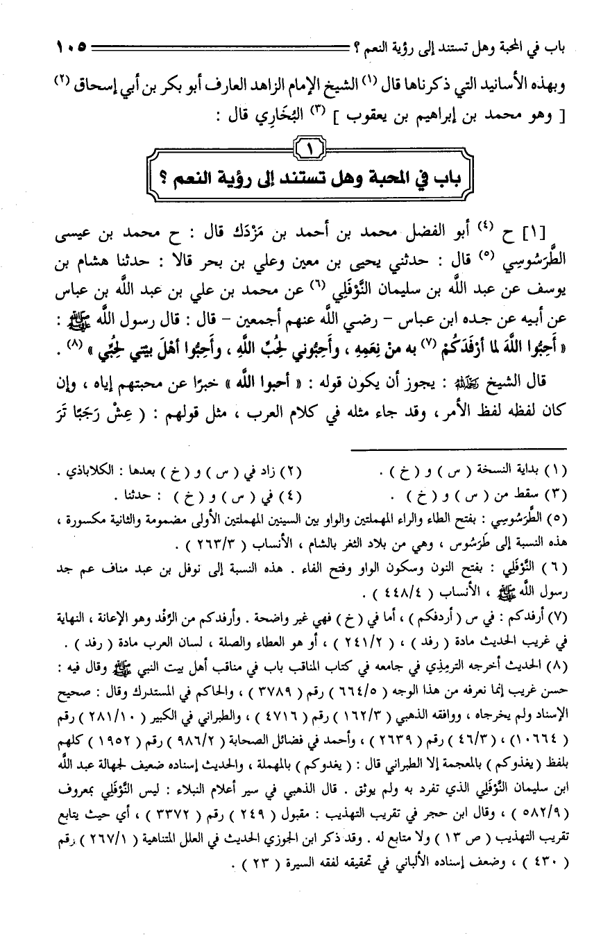 1 - حَدَّثَنَا أَبُو الْفَضْلِ مُحَمَّدُ بْنُ أَحْمَدَ بْنِ مَزْدَكَ قَالَ: حَدَّثَنا مُحَمَّدُ بْنُ عِيسَى الطَّرَسُوسِيُّ قَالَ: حَدَّثَنِي يَحْيَى بْنُ مَعِينٍ , وَعَلِيُّ بْنُ بَحْرٍ , قَالَا: حَدَّثَنَا هِشَامُ بْنُ يُوسُفَ , عَنْ عَبْدِ اللَّهِ بْنِ سُلَيْمَانَ النَّوْفَلِيِّ , عَنْ مُحَمَّدِ بْنِ عَلِيِّ بْنِ عَبْدِ اللَّهِ بْنِ عَبَّاسٍ , عَنْ أَبِيهِ , عَنْ جَدِّهِ ابْنِ عَبَّاسٍ - رَضِيَ اللَّهُ عَنْهُ أجمعين - قَالَ: قَالَ رسول الله صلى الله عليه وسلم: " أَحِبُّوا اللَّهَ لِمَا أرفدكُمْ بِهِ مِنْ نِعَمِهِ , وَأَحِبُّونِي لِحُبِّ اللَّهِ , وَأَحِبُّوا أَهْلَ بَيْتِي لِحُبِّي ".