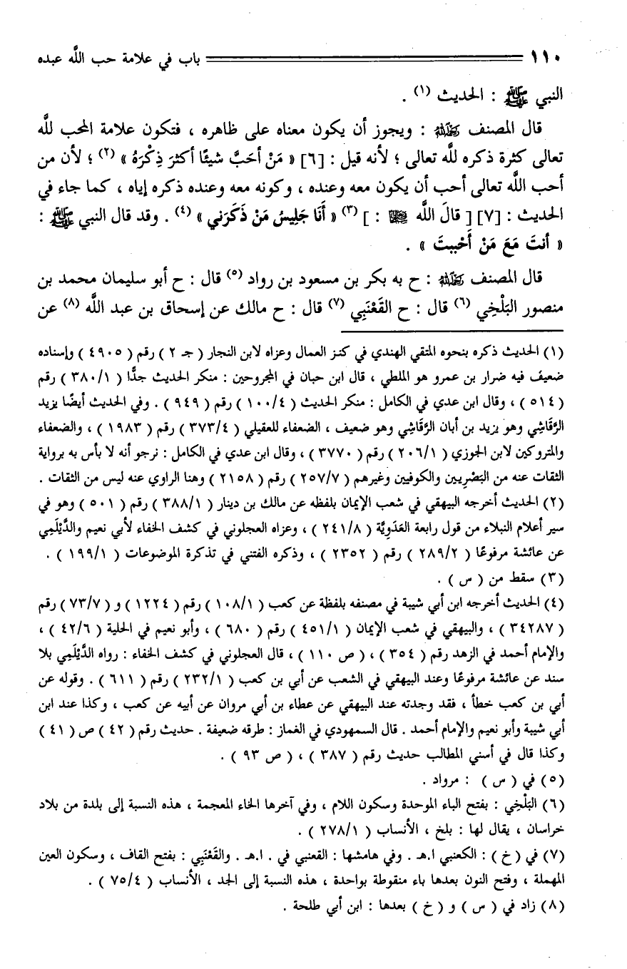 8 - حَدَّثَنَا بكرُ بْنُ مَسْعُودِ بن رواد , قَالَ: حَدَّثَنا أَبُو سُلَيْمَانَ مُحَمَّدُ بْنُ مَنْصُورٍ الْبَلْخِيُّ قَالَ: حَدَّثَنا الْقَعْنَبِيُّ قَالَ: حَدَّثَنا مَالِكٌ , عَنْ إِسْحَاقَ بْنِ عَبْدِ اللَّهِ بْنِ أَبِي طَلْحَةَ , عَنْ أَنَسِ بْنِ مَالِكٍ قال: قال رَجُلٌ: يَا رَسُولَ اللَّهِ - صلى الله عليه وسلم - مَتَى السَّاعَةُ؟ فَقَالَ لَهُ: مَا أَعْدَدْتَ لَهَا؟ قَالَ: حُبَّ اللَّهِ وَرَسُولِهِ , قَالَ: أَنْتَ مَعَ مَنْ أَحْبَبْتَ ".