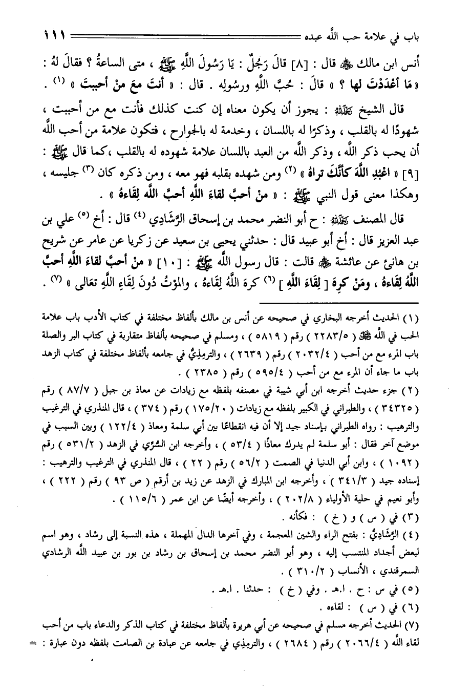 10 - حَدَّثَنَا أَبُو النَّضْرِ مُحَمَّدُ بْنُ إِسْحَاقَ الرَّشَادِيُّ، حَدَّثَنا عَلِيُّ بْنُ عَبْدِ الْعَزِيزِ، أنبأنا أَبُو عُبَيْدٍ قَالَ: حَدَّثَنِي يَحْيَى بْنُ سَعِيدٍ , عن زكريا، عَنْ عَامِرٍ , عَنْ شُرَيْحِ بْنِ هَانِئٍ , عَنْ عَائِشَةَ , رَضِيَ اللَّهُ عَنْهما قَالَتْ: قَالَ رَسُولُ اللَّهِ صلى الله عليه وسلم: " مَنْ أَحَبَّ لِقَاءَ اللَّهِ أَحَبَّ اللَّهُ لِقَاءَهُ , وَمَنْ كَرِهَ لِقَاءَهُ كَرِهَ اللَّهُ لِقَاءَهُ , وَالْمَوْتُ دُونَ لِقَاءِ اللَّهِ تعالى ".