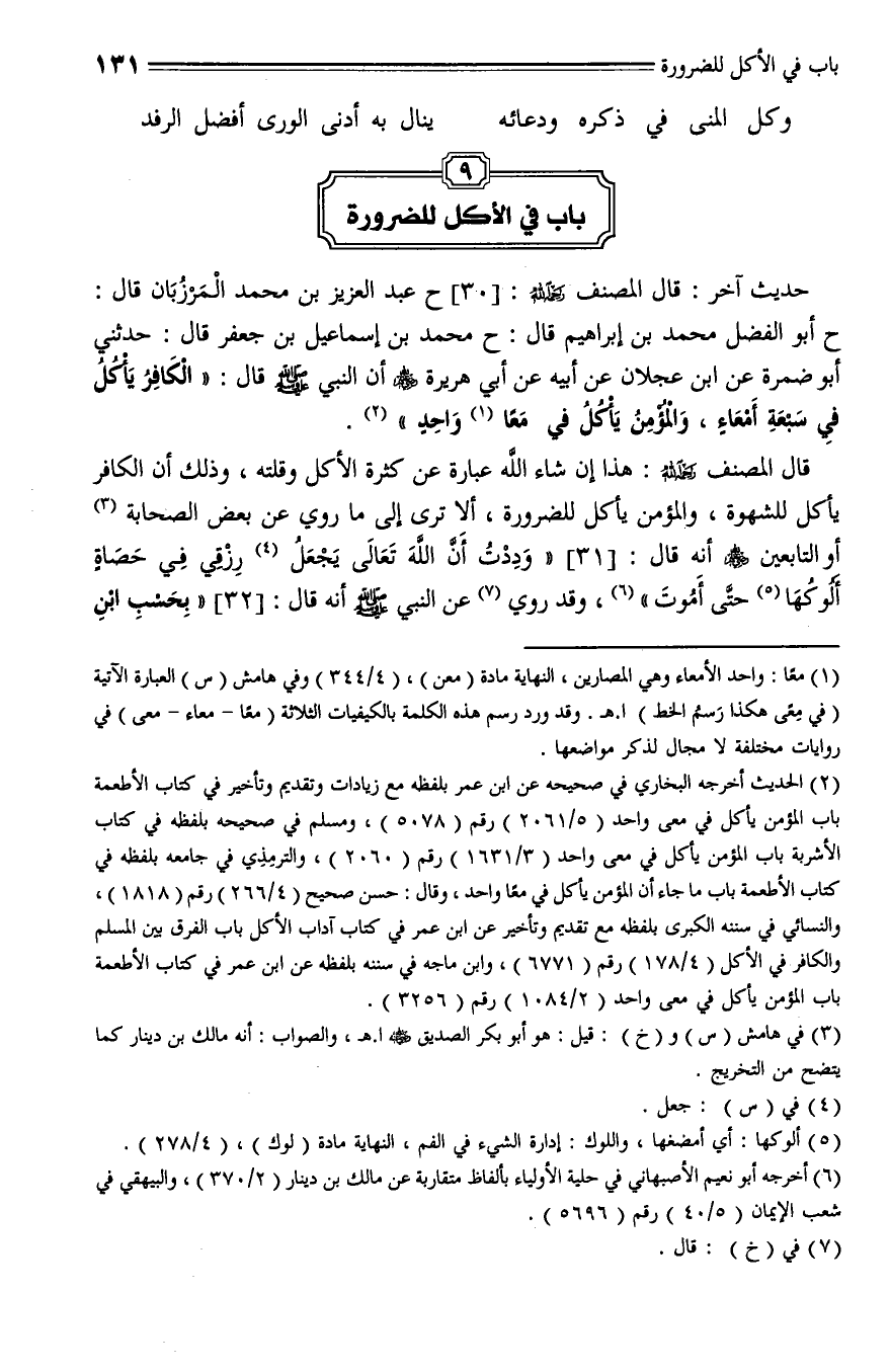30 - حَدَّثَنَا عَبْدُ الْعَزِيزِ بْنُ مُحَمَّدِ بْنِ الْمَرْزُبَانِ , قال: حَدَّثَنا أَبُو الْفَضْلِ مُحَمَّدُ بْنُ إِبْرَاهِيمَ، قال: حَدَّثَنا مُحَمَّدُ بْنُ إِسْمَاعِيلَ بْنِ جَعْفَرٍ، قال: حَدَّثَنِي أَبُو ضمرةَ , عَنِ ابْنِ عَجْلَانَ , عَنْ أَبِيهِ , عَنْ أَبِي هُرَيْرَةَ - رضي الله عنه - أَنَّ النبي - صلى الله عليه وسلم - قَالَ: " الْكَافِرُ يَأْكُلُ فِي سَبْعَةِ أَمْعَاءٍ , وَالْمُؤْمِنُ يَأْكُلُ فِي مِعًى وَاحِدٍ ".