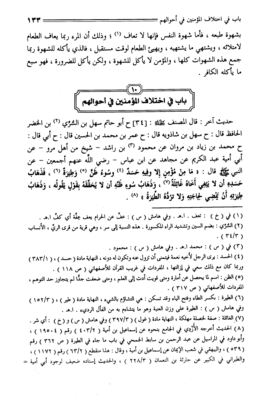 34 - حَدَّثَنَا أَبُو حَاتِمٍ سَهْلُ بْنُ السَّرِيِّ بْنِ الْخَضِرِ الْحَافِظُ، قال: حَدَّثَنا سَهْلُ بْنُ شَاذَوَيْهِ، قال: حَدَّثَنا عُمَرُ بْنُ مُحَمَّدِ بْنِ الْحُسَيْنِ، قال: حَدَّثَنا أَبِي، قال: حَدَّثَنا مُحَمَّدُ بْنُ زِيَادِ بْنِ مَرْوَانَ , عَنْ مَحْمُودِ بْنِ رَاشِدٍ - شَيْخٍ مِنْ أَهْلِ مَرْوَ - عَنْ أَبِي أُمَيَّةَ عَبْدِ الْكَرِيمِ , عَنْ مُجَاهِدٍ , عَنِ ابْنِ عَبَّاسٍ - رضي الله عنهم أجمعين -، عن النبي صلى الله عليه وسلم، قَالَ: " مَا مِنْ مُؤْمِنٍ إِلَّا وَفِيهِ حَسَدٌ , وَسُوءُ ظَنٍّ , وَطِيَرَةٌ , فَذَهَابُ حَسَدِهِ أَلَّا يَبْغِيَ أَخَاهُ غَائِلَةً , وَذَهَابُ سُوءِ ظَنِّهِ أَنْ لَا يُحَقِّقَهُ بِقَوْلٍ يَقُولُهُ , وَذَهَابُ طِيَرَتِهِ أَنْ يَمْضِيَ لِحَاجَتِهِ وَلَا تَرُدَّهُ الطِّيَرَةُ ".