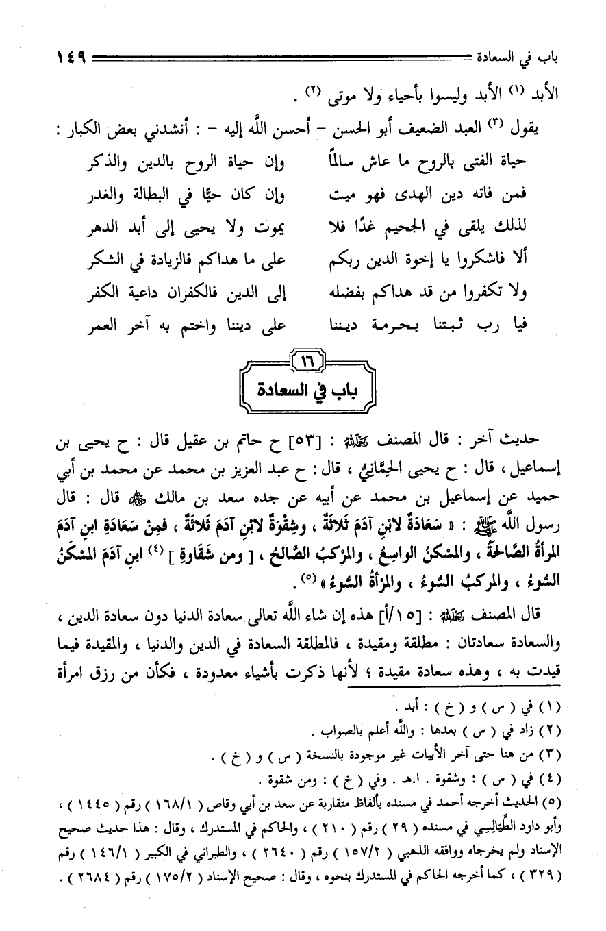 53 - حَدَّثَنَا حَاتِمُ بْنُ عَقِيلٍ , قال: حَدَّثَنا يَحْيَى بْنُ إِسْمَاعِيلَ، قال: حَدَّثَنا يحيى الْحِمَّانِيُّ، قال: حَدَّثَنا عَبْدُ الْعَزِيزِ بْنُ مُحَمَّدٍ , عَنْ مُحَمَّدِ بْنِ أَبِي حُمَيْدٍ , عَنْ إِسْمَاعِيلَ بْنِ مُحَمَّدٍ , عَنْ أَبِيهِ , عَنْ جَدِّهِ سَعْدِ بْنِ مَالِكٍ، قَالَ رسول الله صلى الله عليه وسلم: " سَعَادَةٌ لِابْنِ آدَمَ ثَلَاثَةٌ , وَشَقَاوَةٌ لِابْنِ آدَمَ ثَلَاثَةٌ , فَمِنْ سَعَادَةِ ابْنِ آدَمَ: الْمَرْأَةُ الصَّالِحَةُ , وَالْمَسْكَنُ الْوَاسِعُ , وَالْمَرْكَبُ الصَّالِحُ , وَمن شَقَاوَةُ ابْنِ آدَمَ: الْمَسْكَنُ السُّوءُ , وَالْمَرْأَةُ السُّوءُ , وَالْمَرْكَبُ السُّوءُ ".